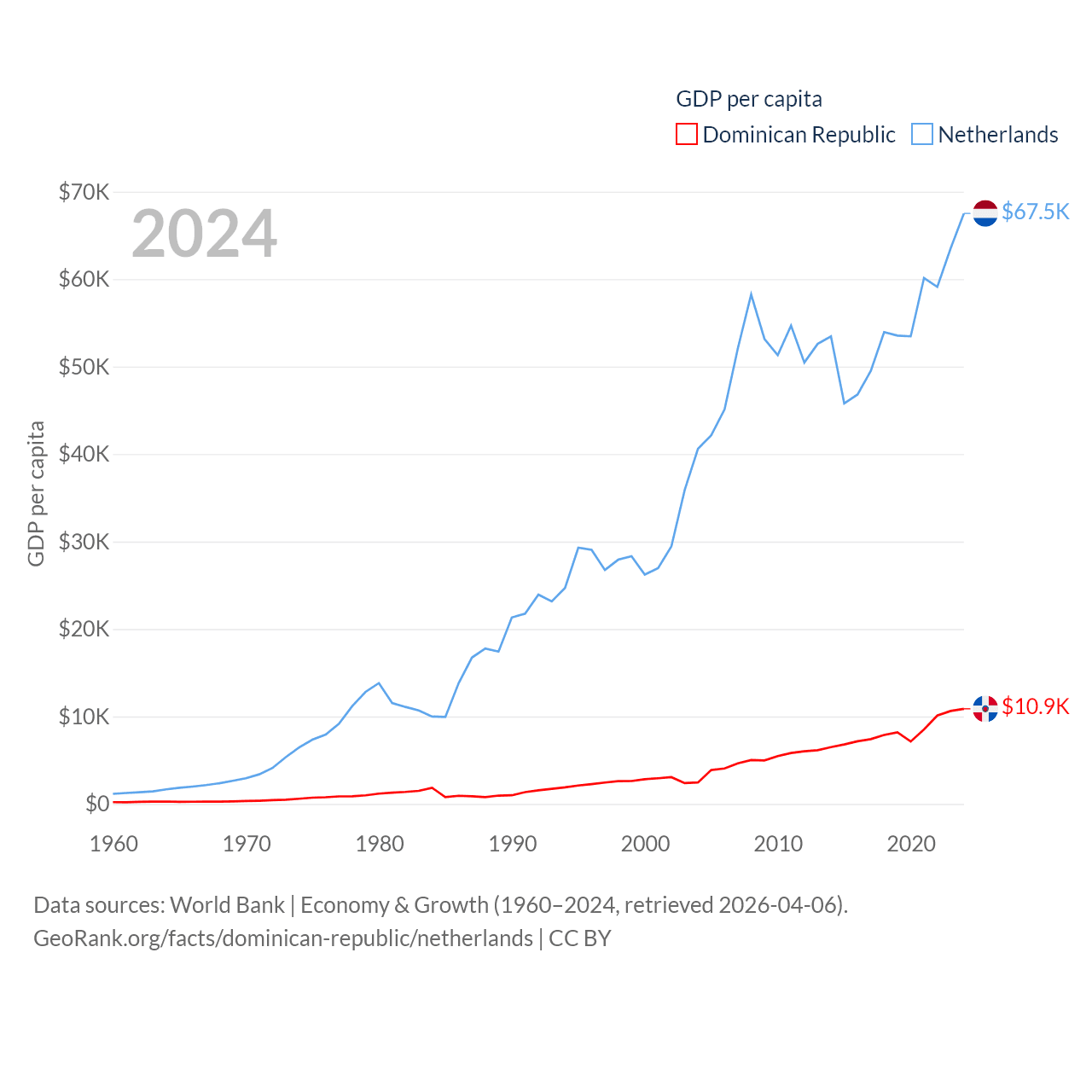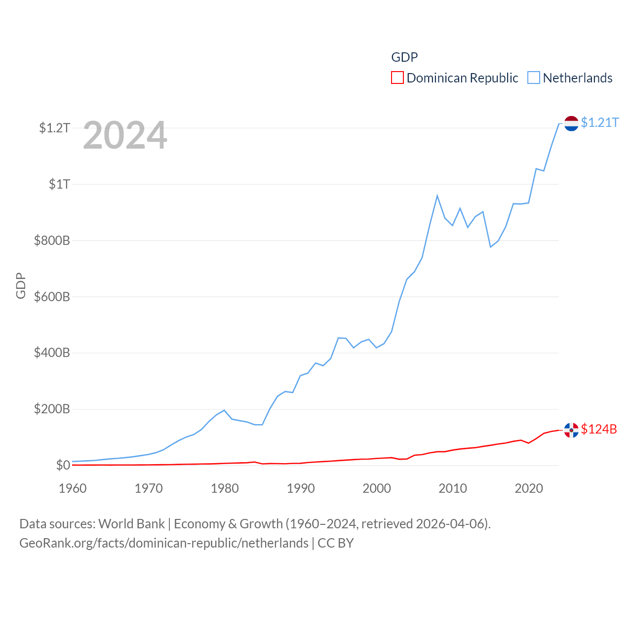 By GDP, The Dominican Republic ranks 63/197 ($124B) and The Netherlands ranks 19/197 ($1.21T). By GDP per capita, The Dominican Republic ranks 83/197 ($10,876), while The Netherlands ranks 13/197 ($67,520).