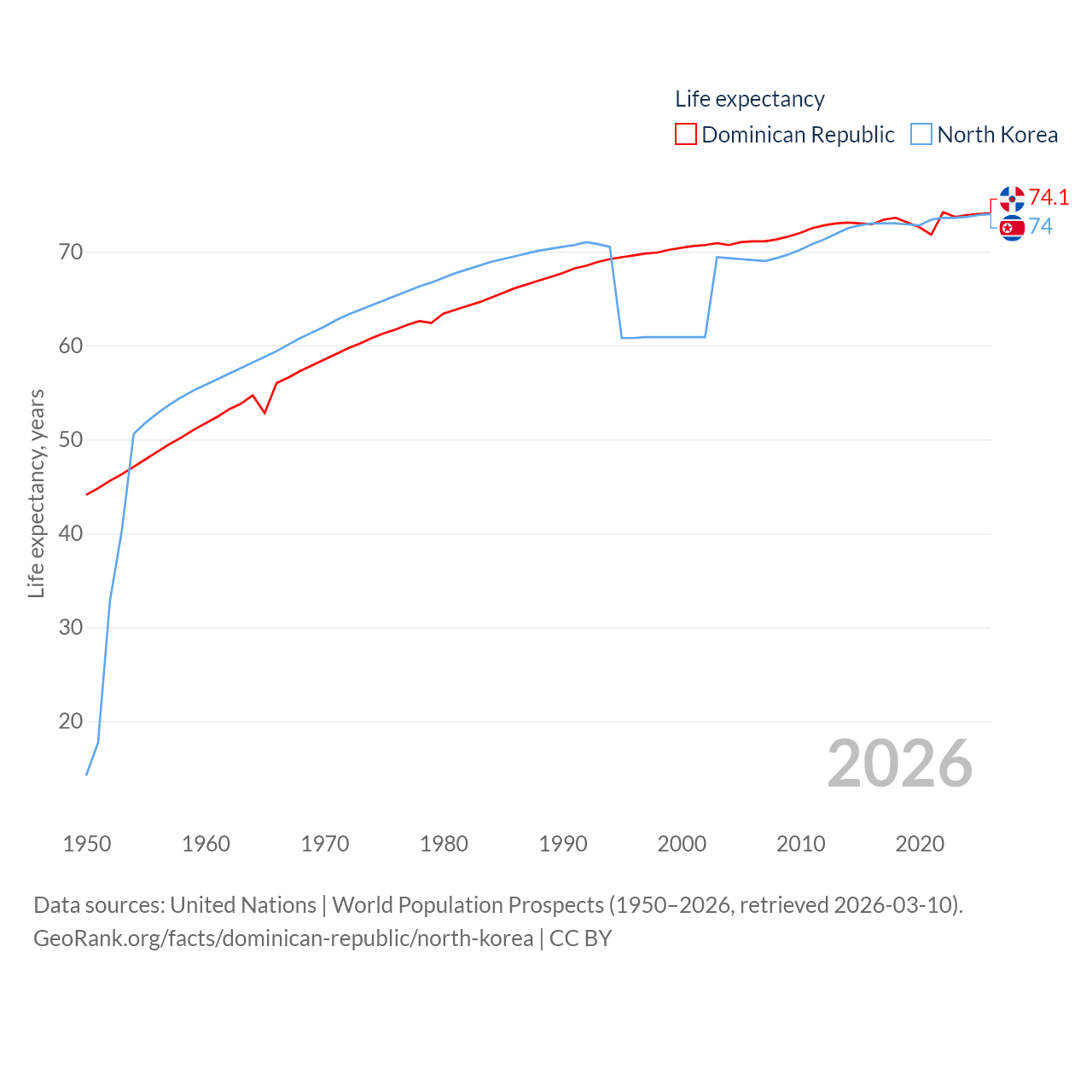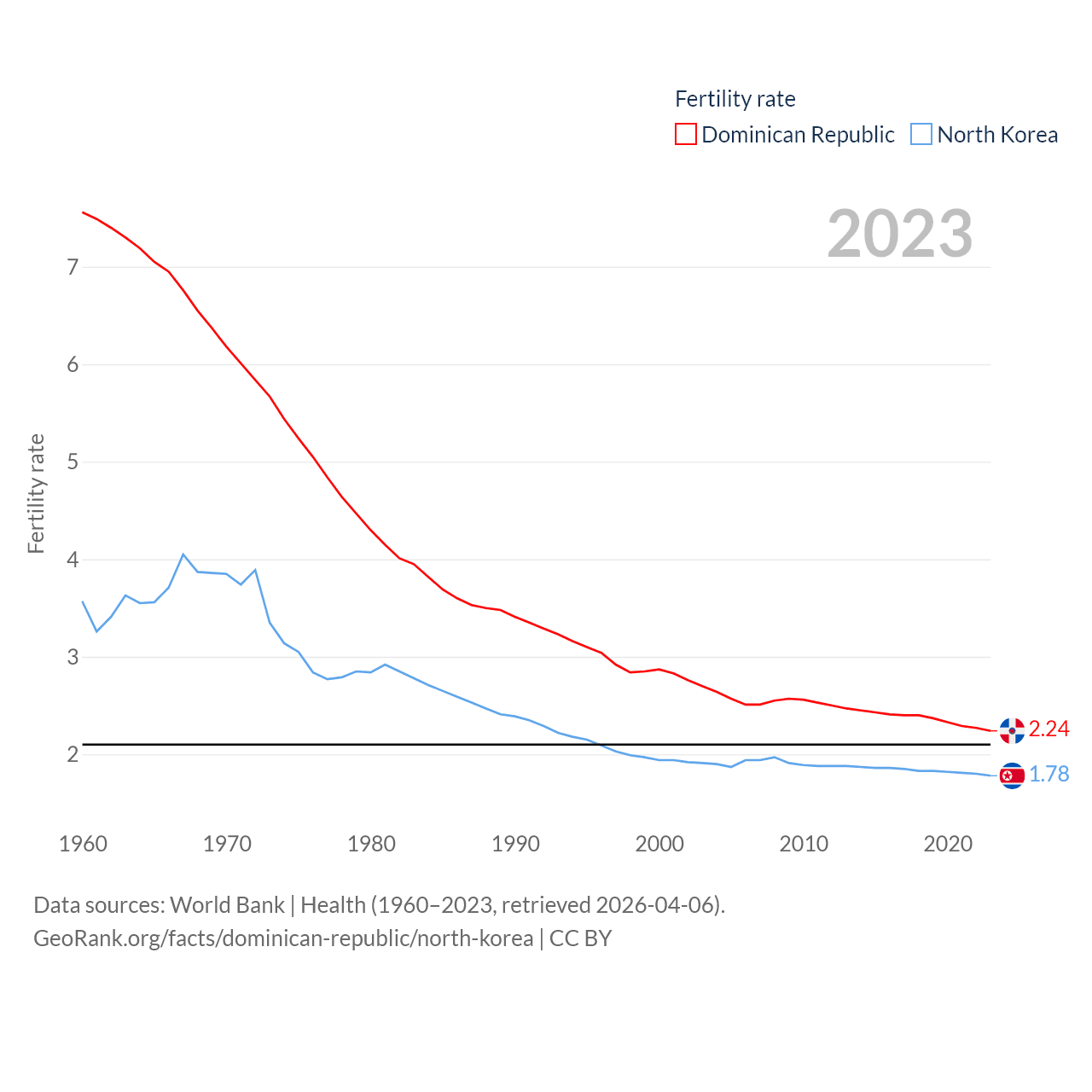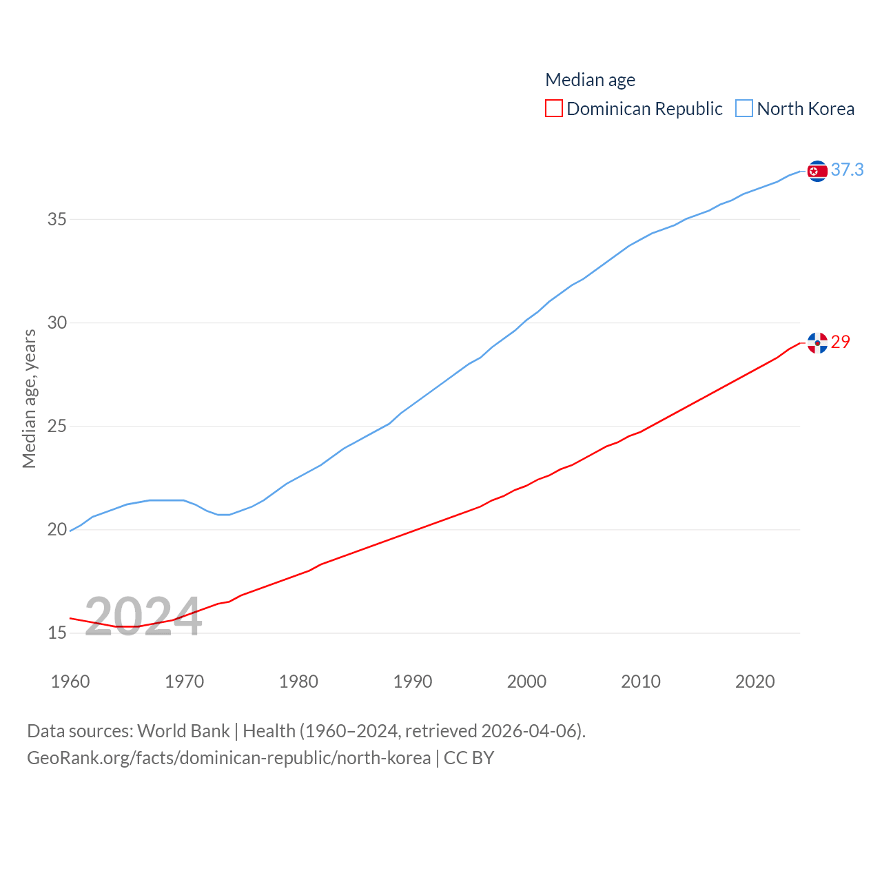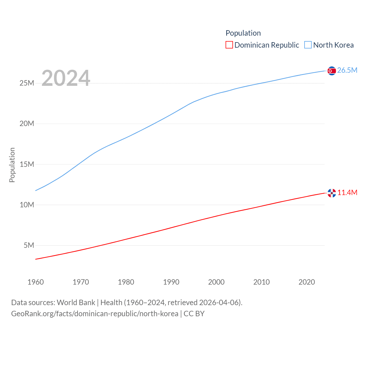 The Dominican Republic has a population of 11.4M (ranked 85/197), compared with 26.5M in North Korea (ranked 56/197). The Dominican Republic's land area is 18,609 sq mi versus 46,491 sq mi for North Korea (ranked 127th vs. 97th).