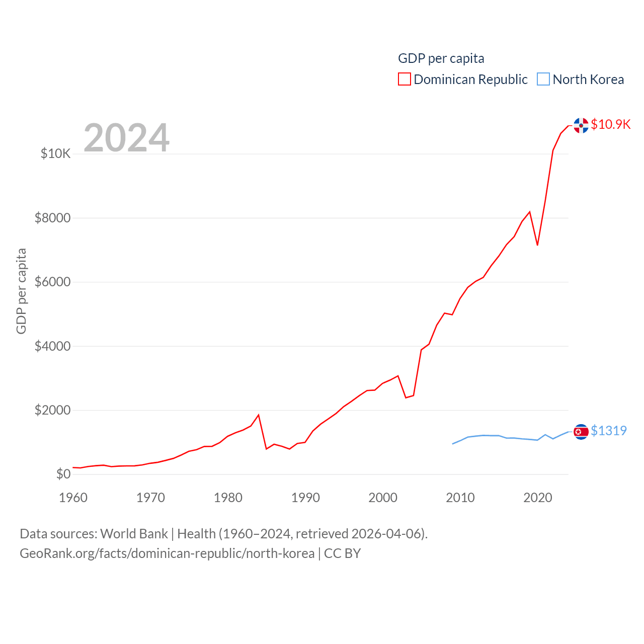 By GDP, The Dominican Republic ranks 63/197 ($124B) and North Korea ranks 106/197 ($34.9B). By GDP per capita, The Dominican Republic ranks 83/197 ($10,876), while North Korea ranks 168/197 ($1,319).