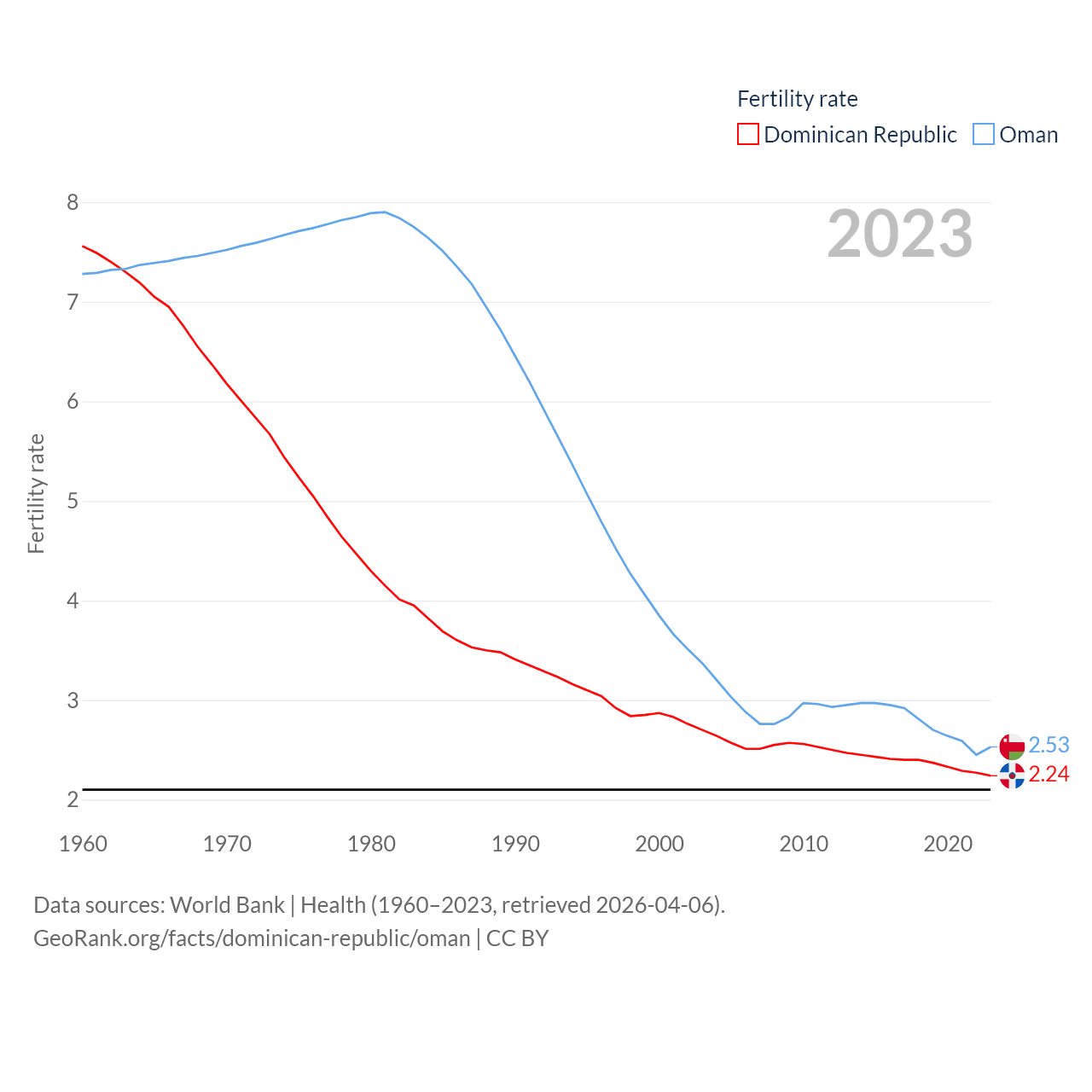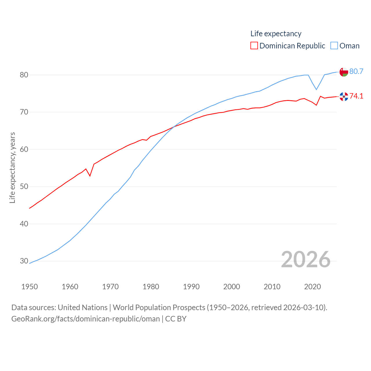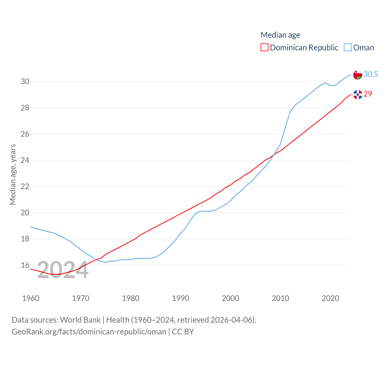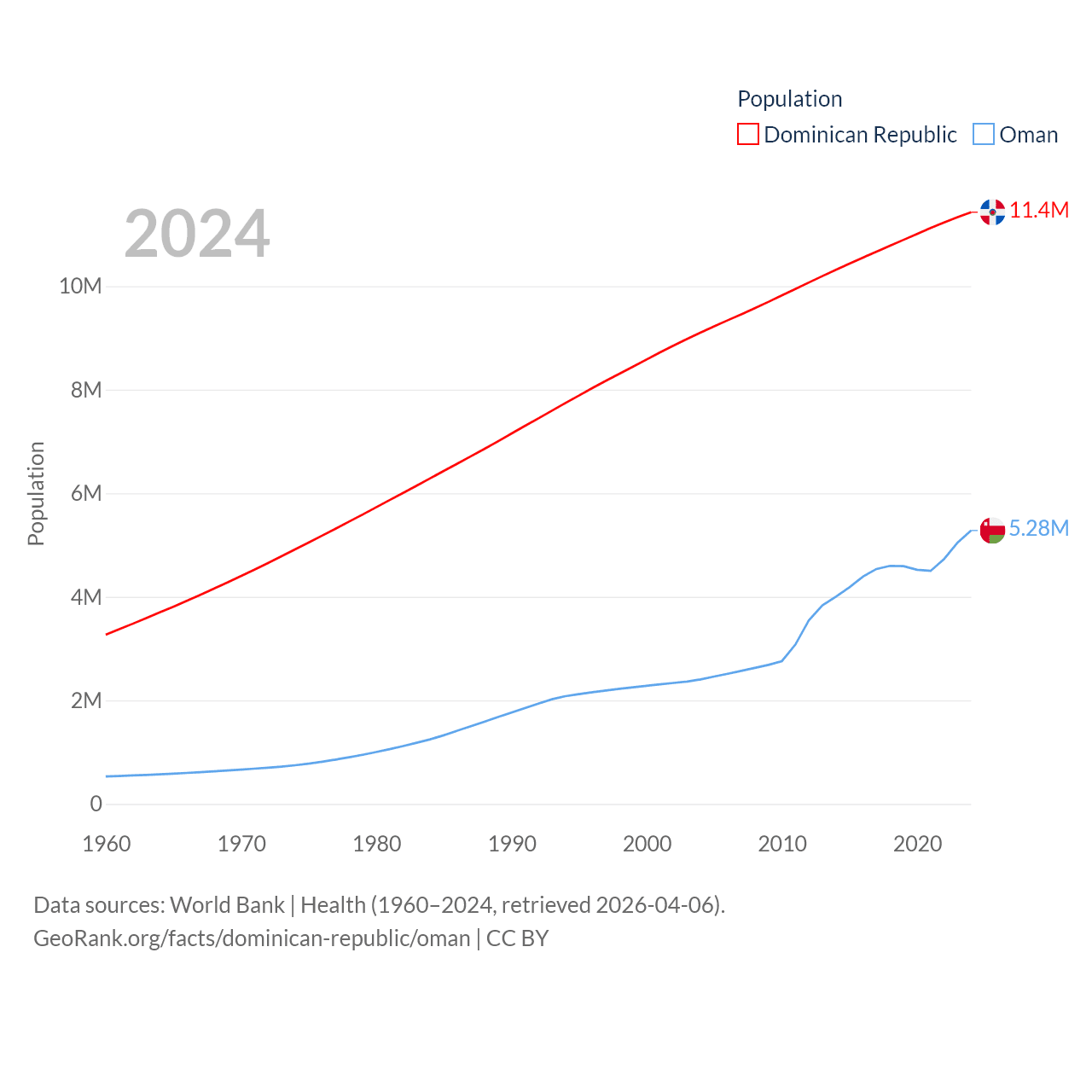 The Dominican Republic has a population of 11.4M (ranked 85/197), compared with 5.28M in Oman (ranked 124/197). The Dominican Republic's land area is 18,609 sq mi versus 119,499 sq mi for Oman (ranked 127th vs. 68th).