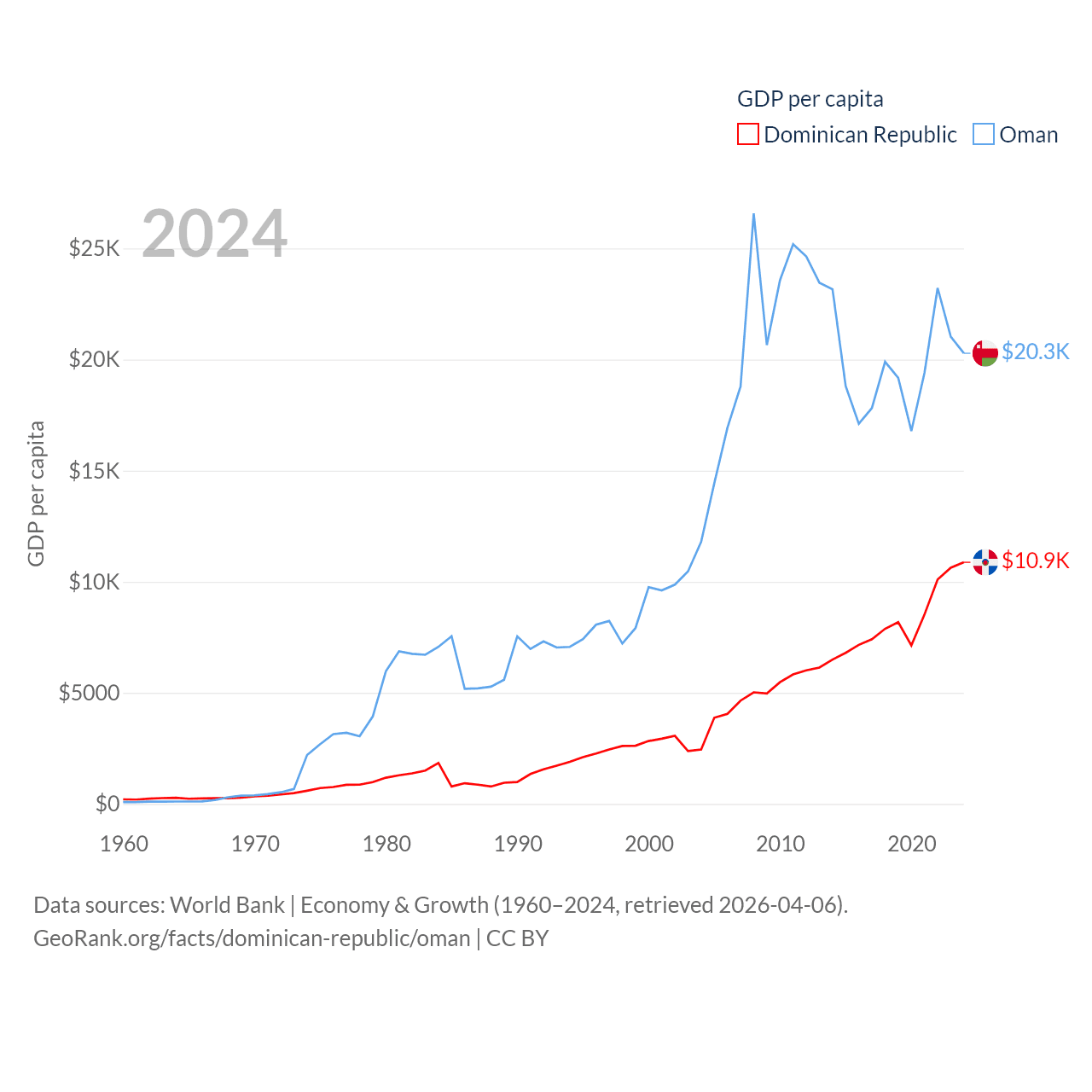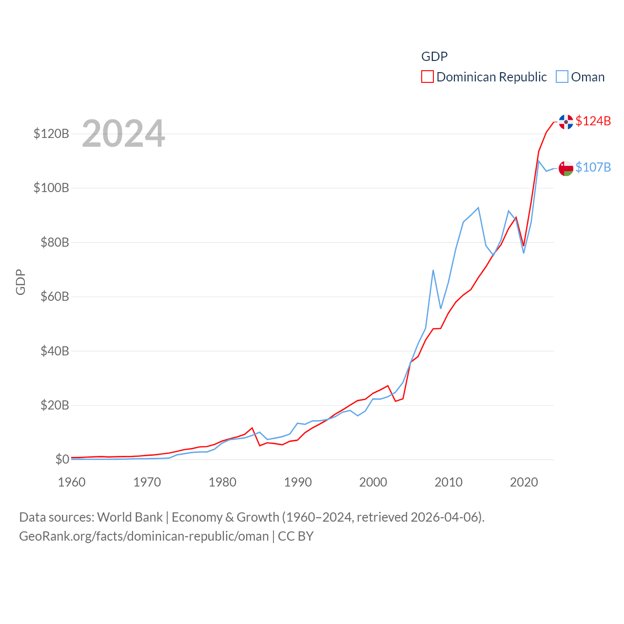 By GDP, The Dominican Republic ranks 63/197 ($124B) and Oman ranks 70/197 ($107B). By GDP per capita, The Dominican Republic ranks 83/197 ($10,876), while Oman ranks 57/197 ($20,285).