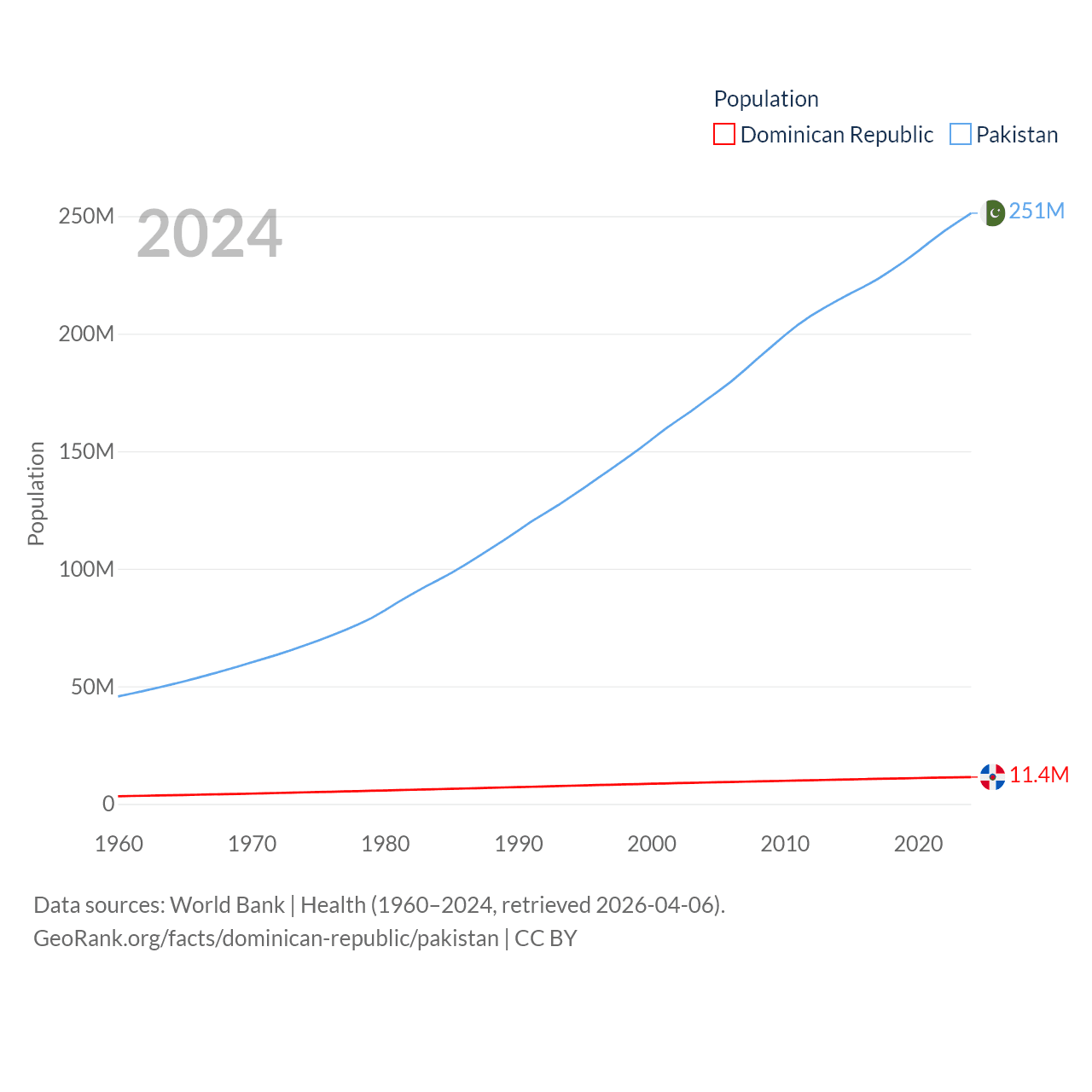 The Dominican Republic has a population of 11.4M (ranked 85/197), compared with 251M in Pakistan (ranked 5/197). The Dominican Republic's land area is 18,609 sq mi versus 297,638 sq mi for Pakistan (ranked 127th vs. 35th).