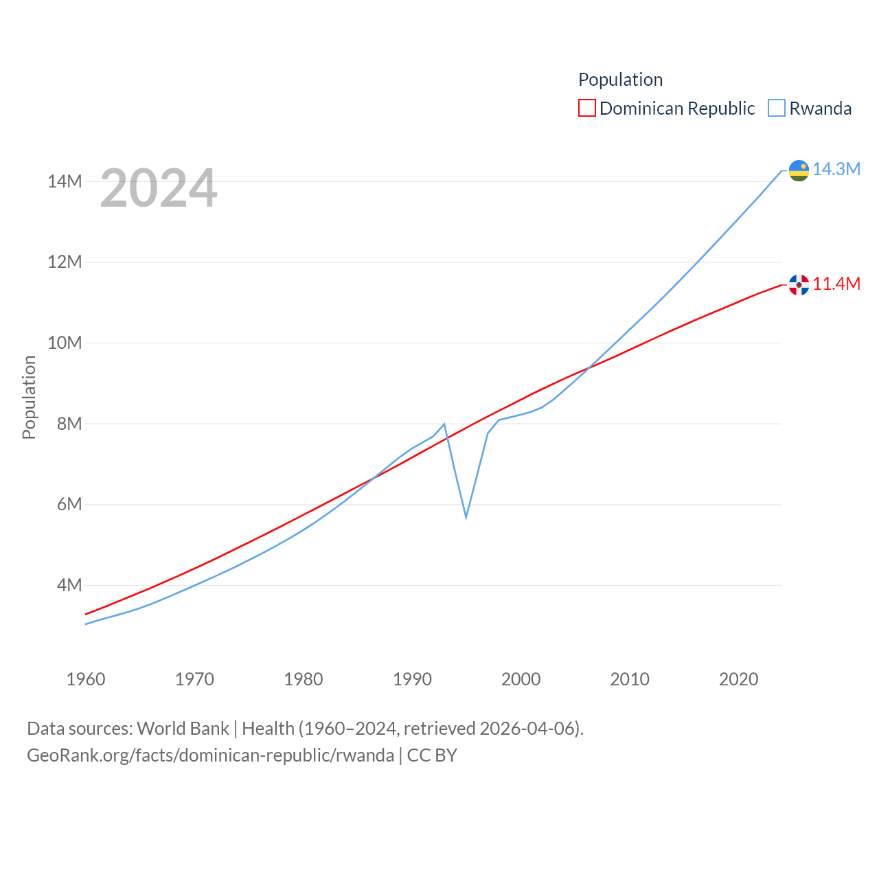 The Dominican Republic has a population of 11.4M (ranked 85/197), compared with 14.3M in Rwanda (ranked 77/197). The Dominican Republic's land area is 18,609 sq mi versus 9,525 sq mi for Rwanda (ranked 127th vs. 146th).