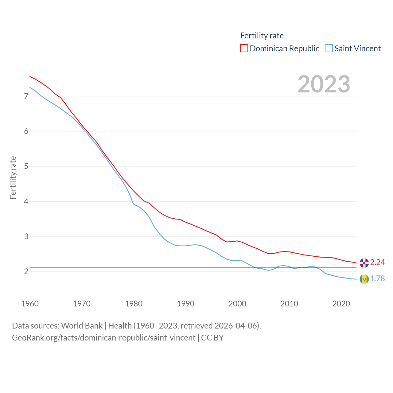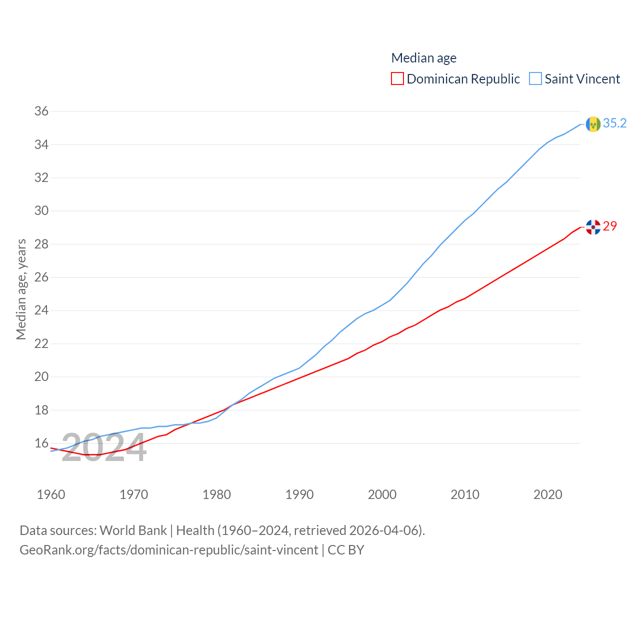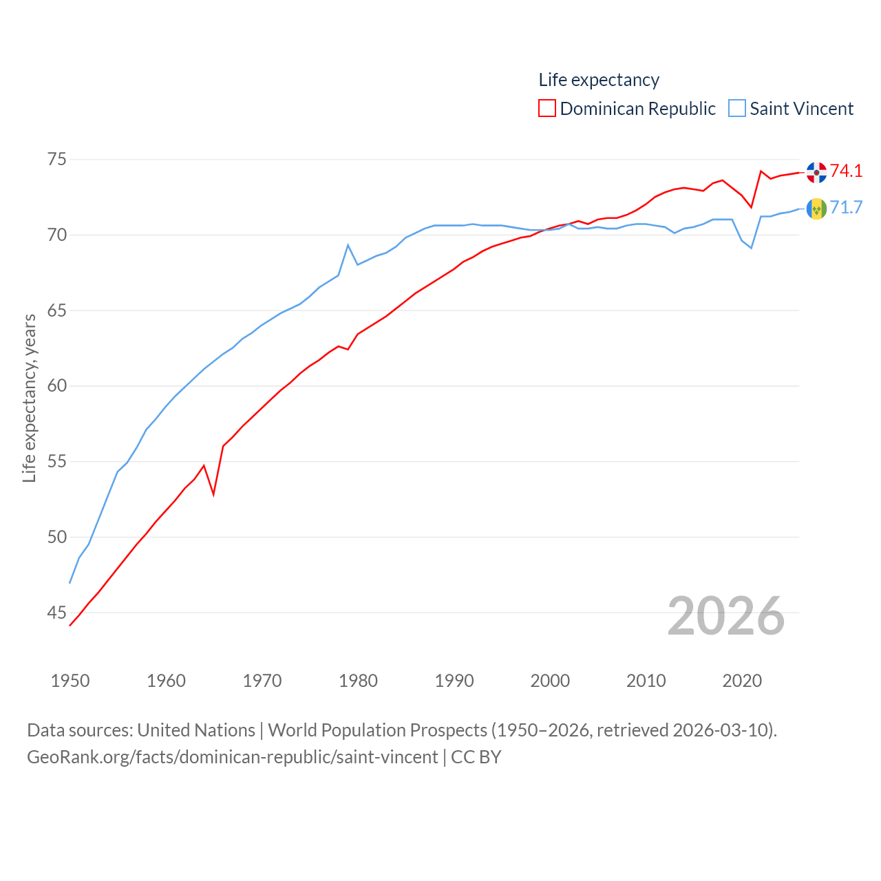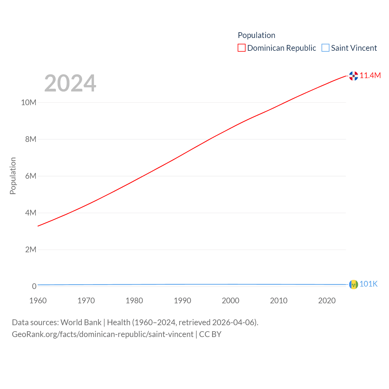 The Dominican Republic has a population of 11.4M (ranked 85/197), compared with 101K in Saint Vincent (ranked 184/197). The Dominican Republic's land area is 18,609 sq mi versus 150.6 sq mi for Saint Vincent (ranked 127th vs. 185th).