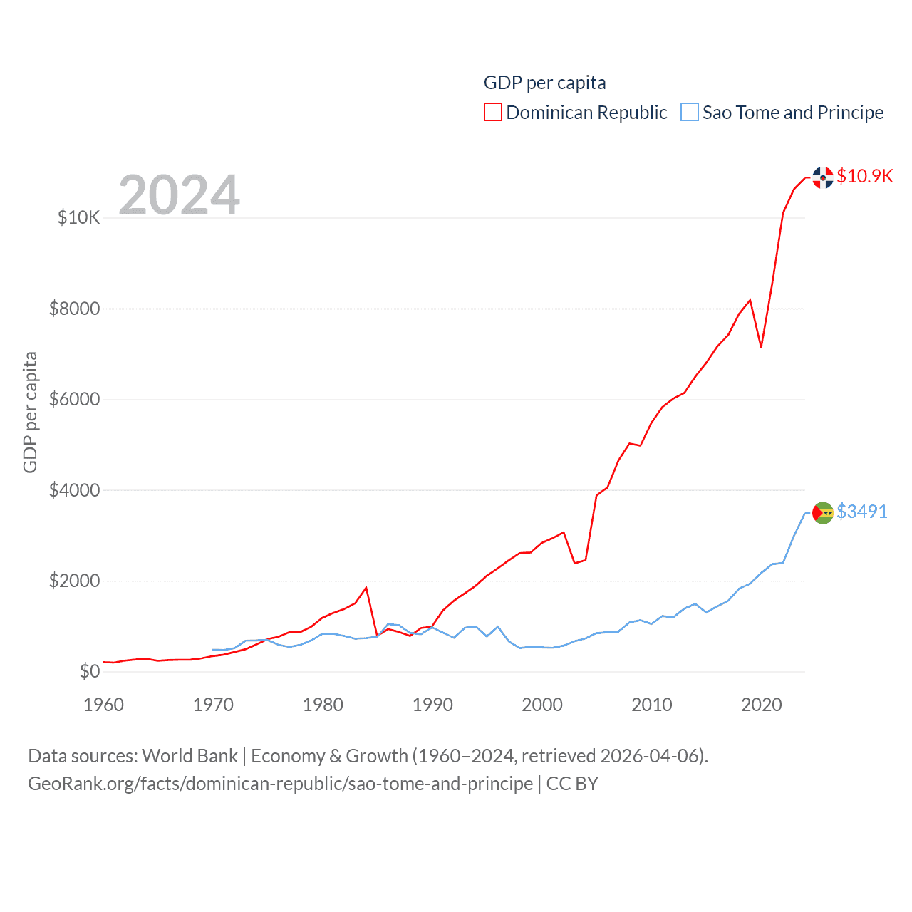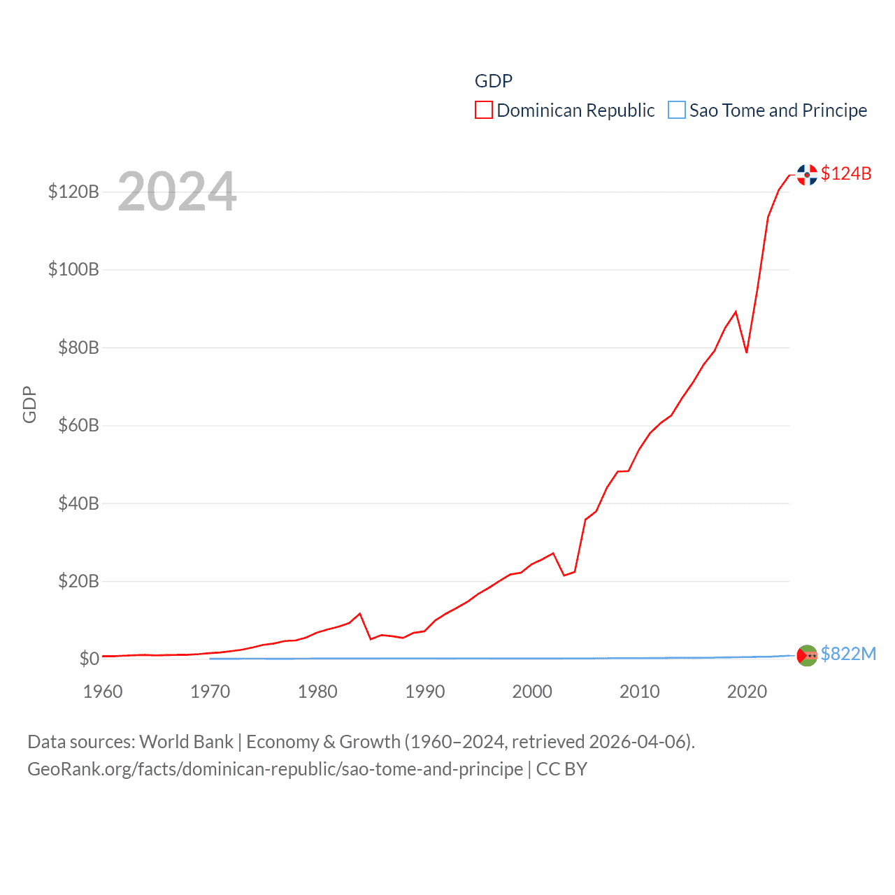 By GDP, The Dominican Republic ranks 63/197 ($124B) and Sao Tome and Principe ranks 189/197 ($822M). By GDP per capita, The Dominican Republic ranks 83/197 ($10,876), while Sao Tome and Principe ranks 134/197 ($3,491).