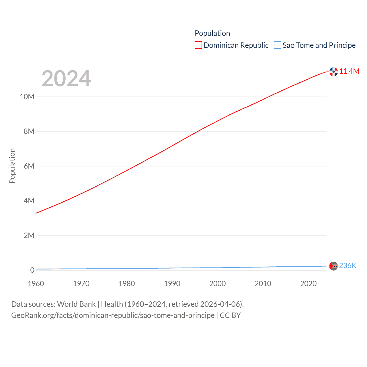 The Dominican Republic has a population of 11.4M (ranked 85/197), compared with 236K in Sao Tome and Principe (ranked 176/197). The Dominican Republic's land area is 18,609 sq mi versus 371 sq mi for Sao Tome and Principe (ranked 127th vs. 172nd).
