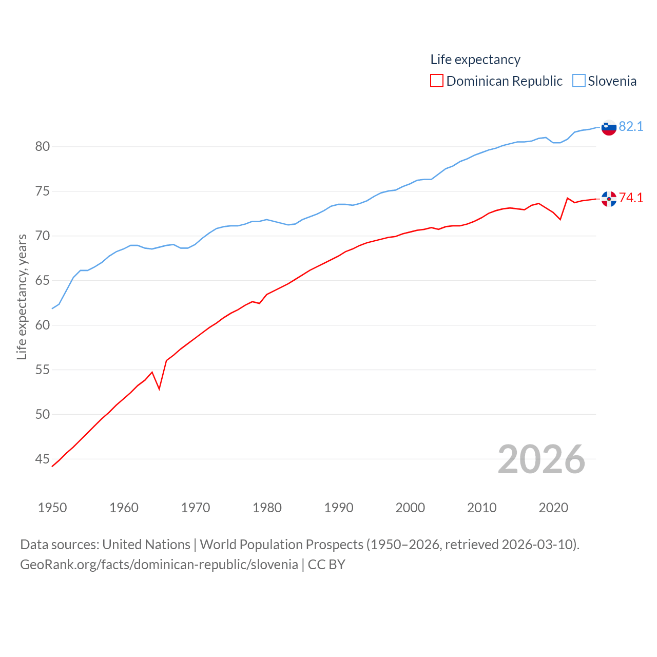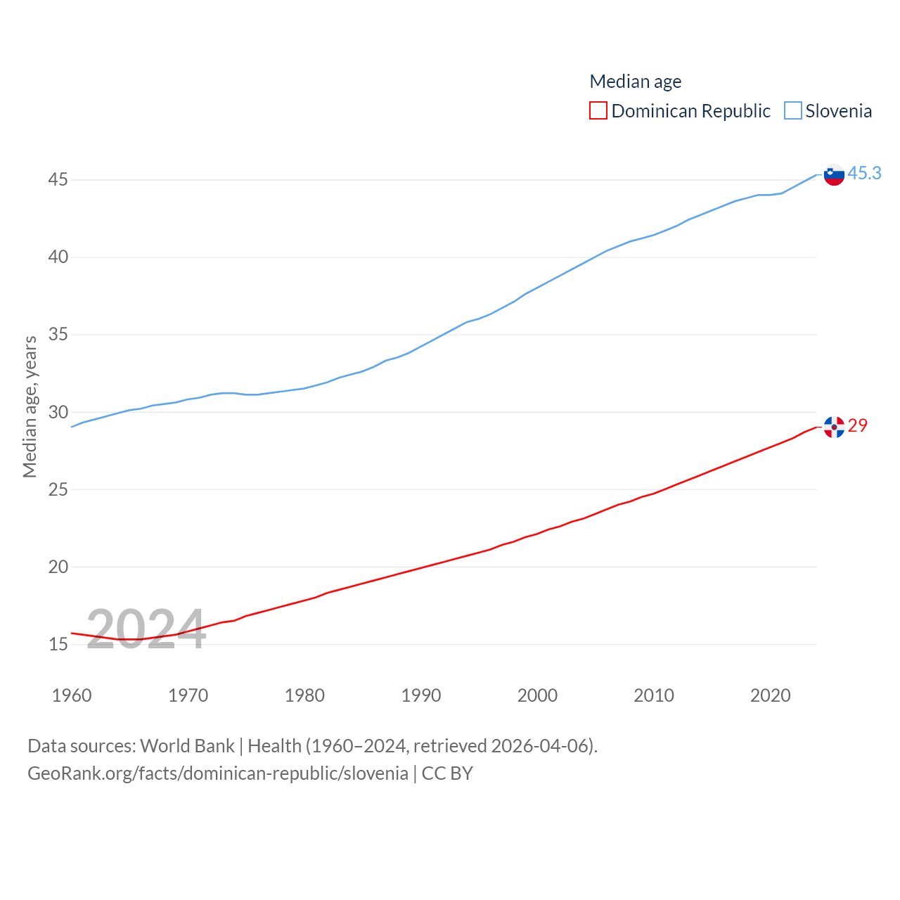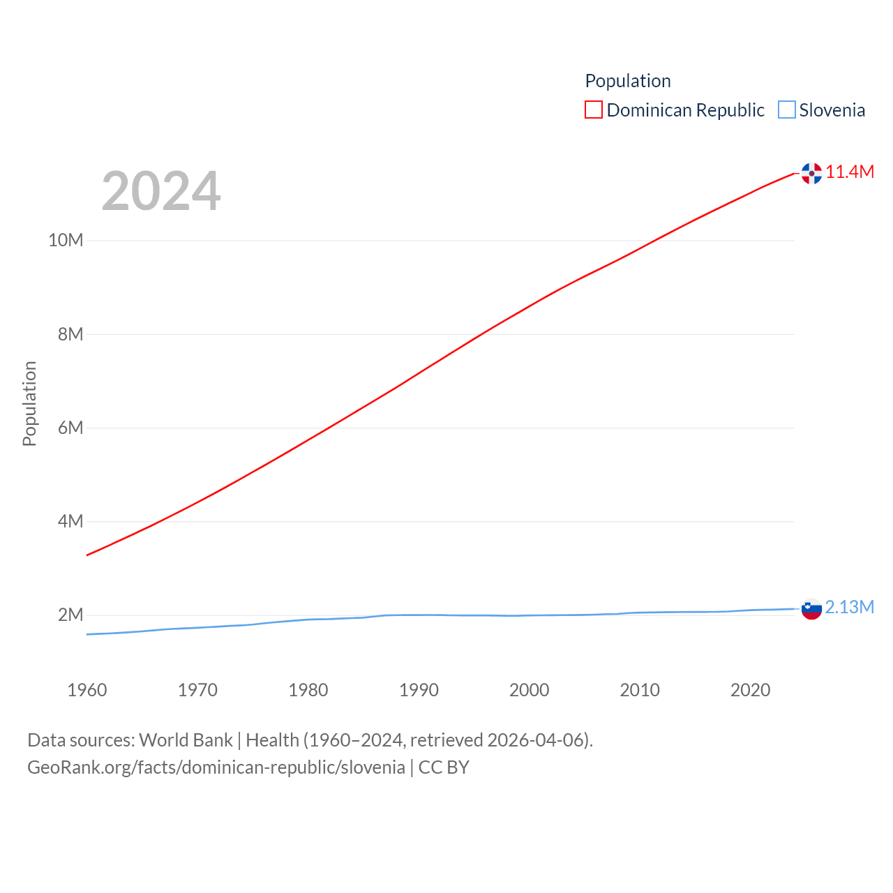 The Dominican Republic has a population of 11.4M (ranked 85/197), compared with 2.13M in Slovenia (ranked 147/197). The Dominican Republic's land area is 18,609 sq mi versus 7,774 sq mi for Slovenia (ranked 127th vs. 151st).