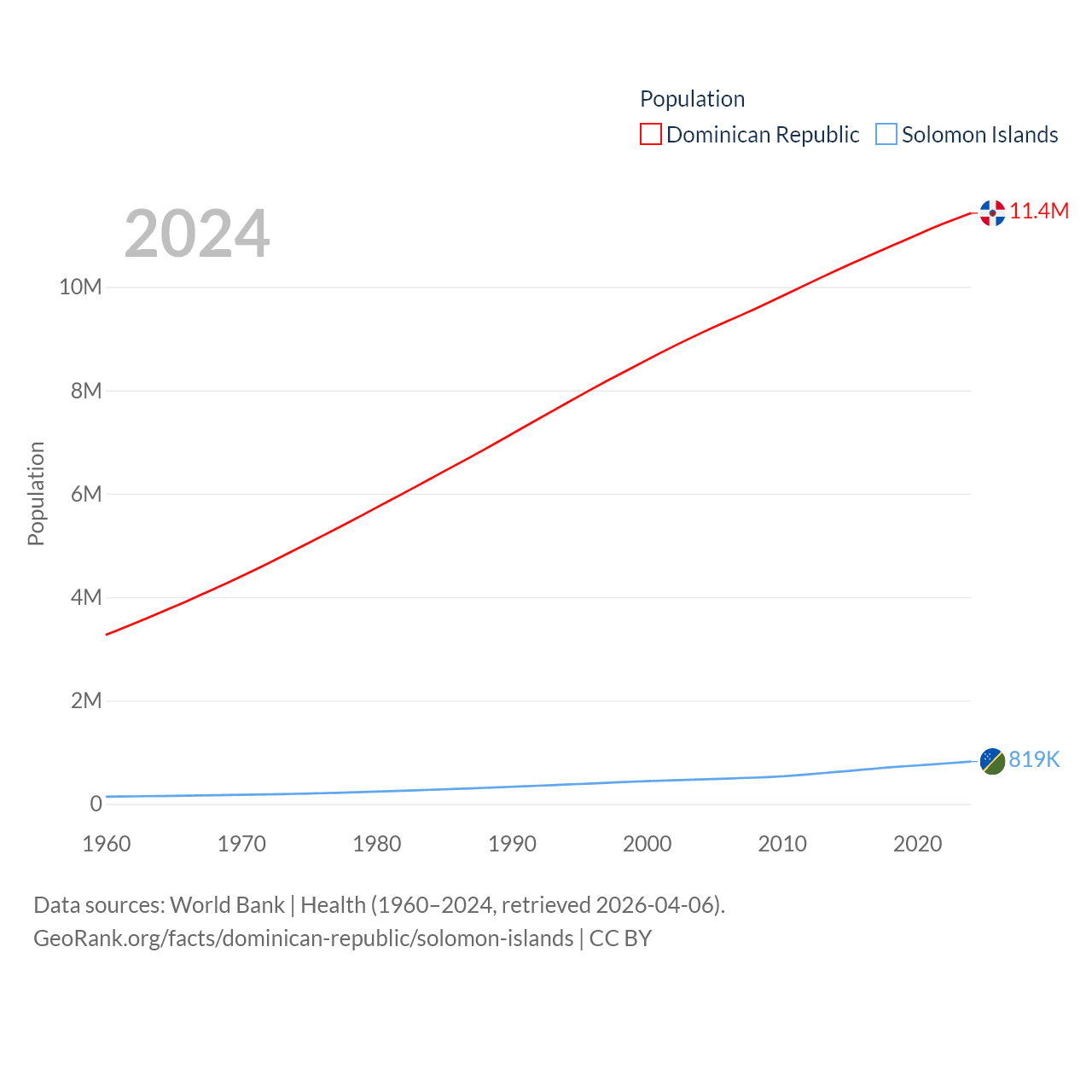 The Dominican Republic has a population of 11.4M (ranked 85/197), compared with 819K in The Solomon Islands (ranked 162/197). The Dominican Republic's land area is 18,609 sq mi versus 10,807 sq mi for The Solomon Islands (ranked 127th vs. 141st).