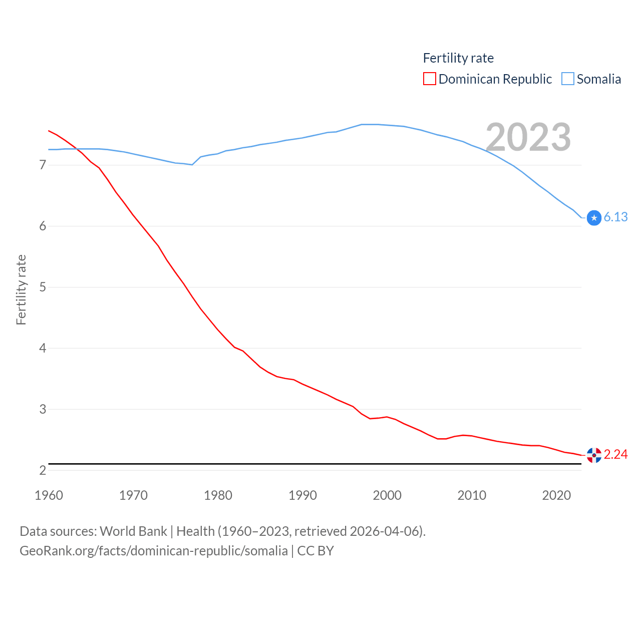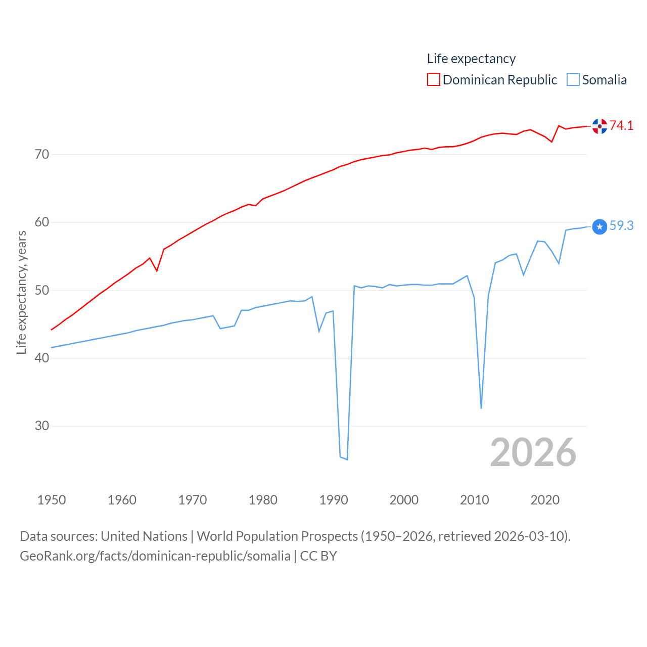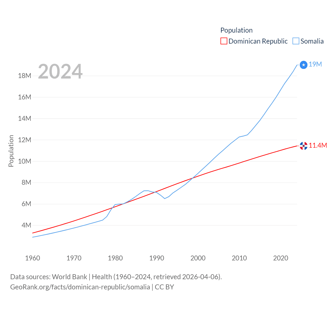 The Dominican Republic has a population of 11.4M (ranked 85/197), compared with 19M in Somalia (ranked 68/197). The Dominican Republic's land area is 18,609 sq mi versus 242,217 sq mi for Somalia (ranked 127th vs. 42nd).