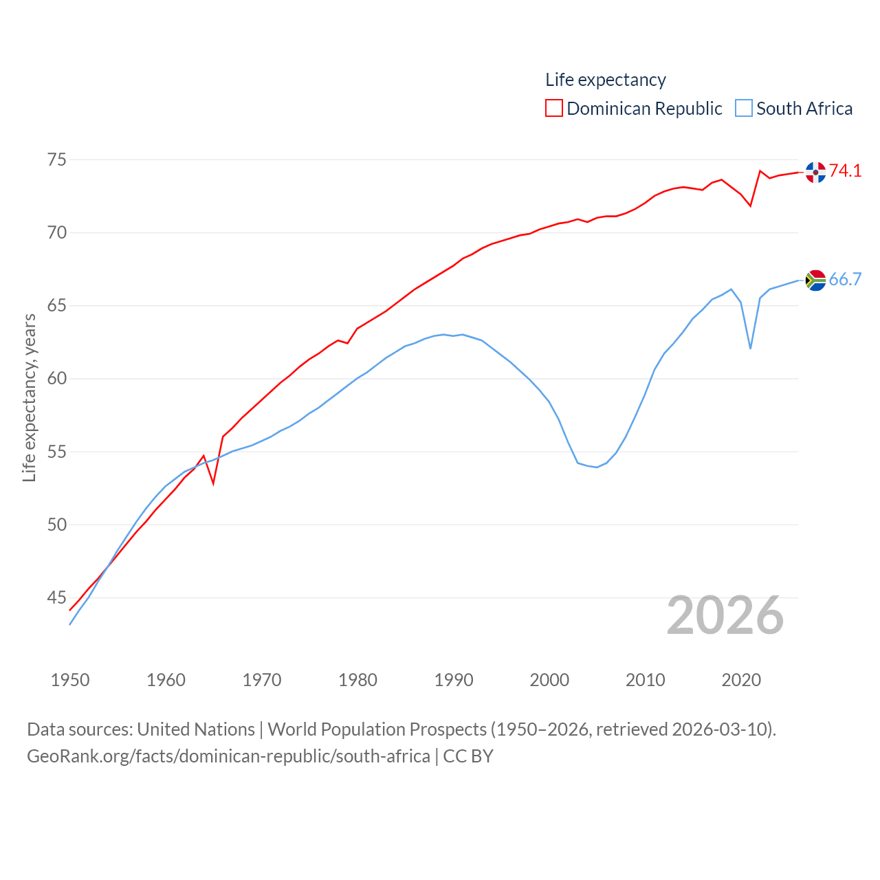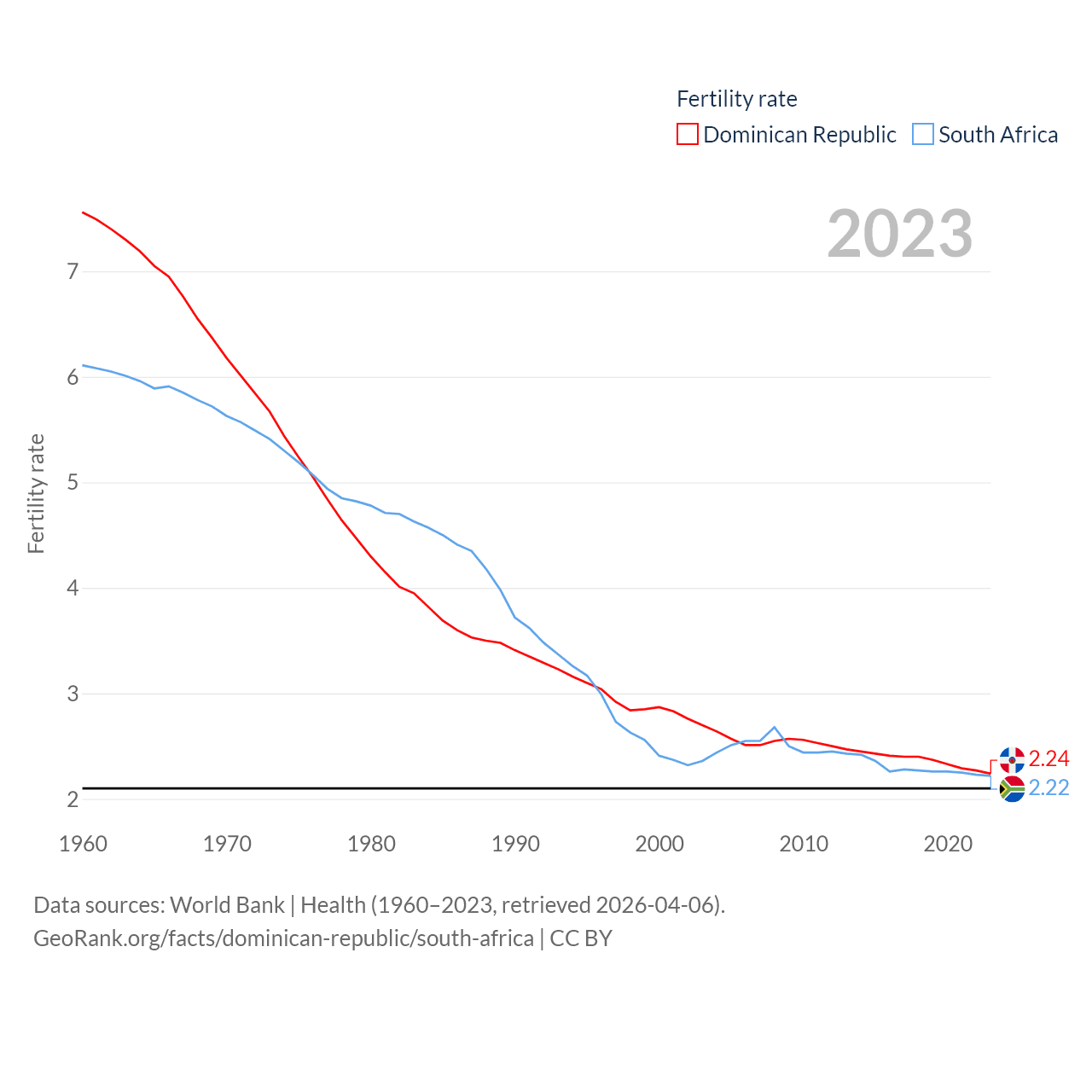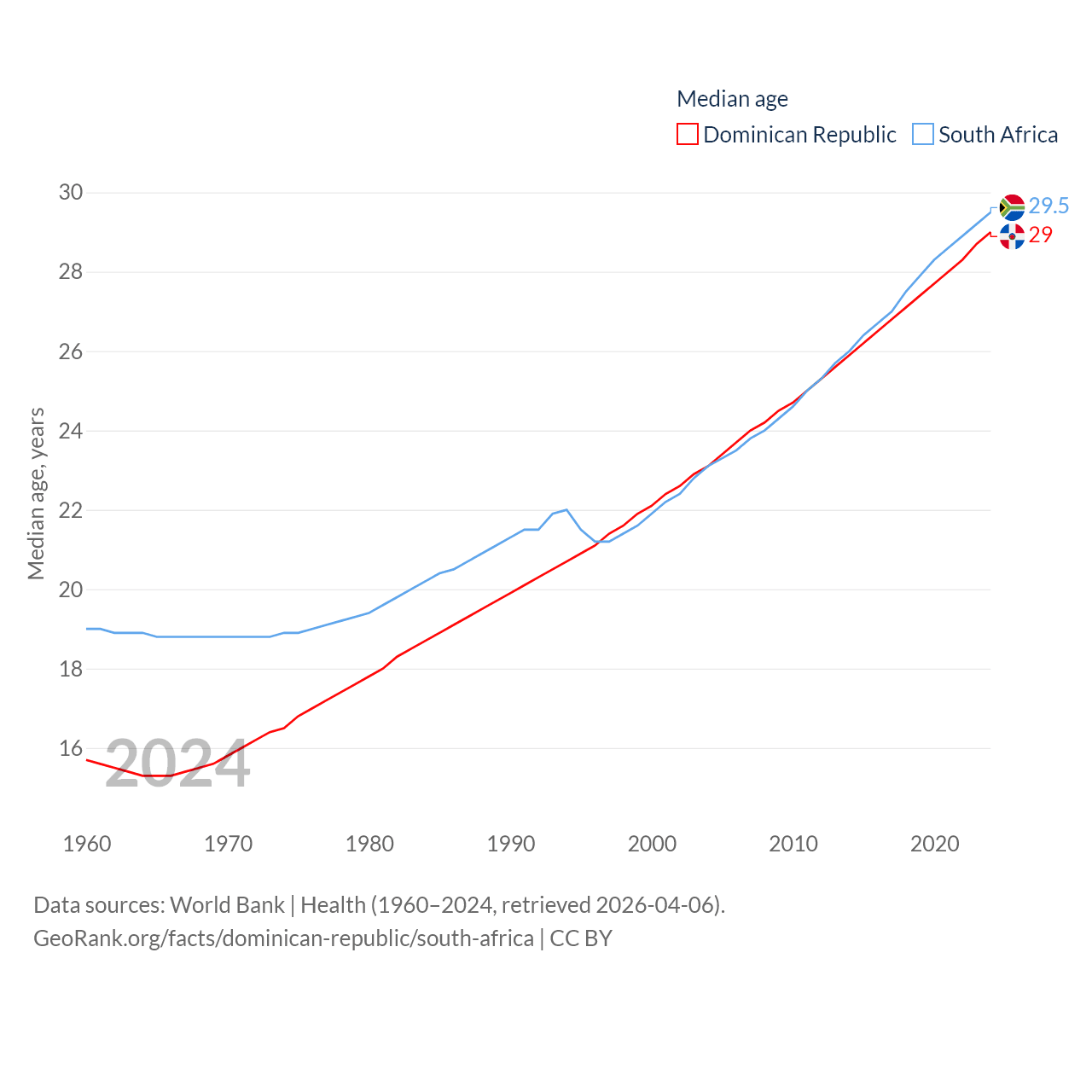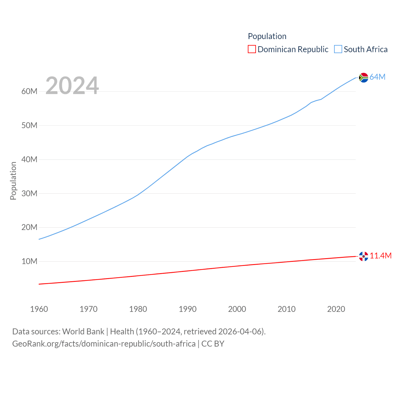 The Dominican Republic has a population of 11.4M (ranked 85/197), compared with 64M in South Africa (ranked 24/197). The Dominican Republic's land area is 18,609 sq mi versus 468,377 sq mi for South Africa (ranked 127th vs. 24th).