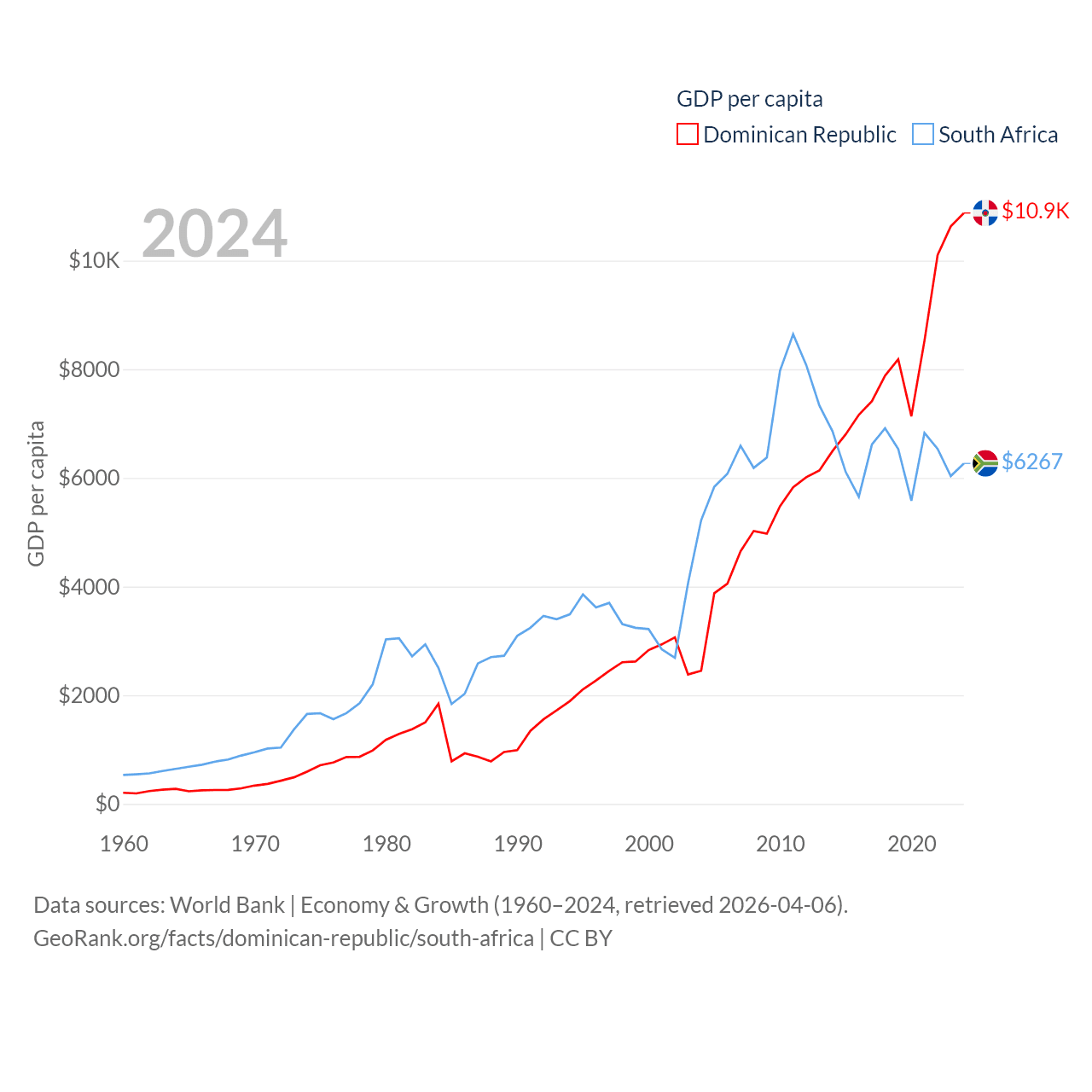 By GDP, The Dominican Republic ranks 63/197 ($124B) and South Africa ranks 40/197 ($401B). By GDP per capita, The Dominican Republic ranks 83/197 ($10,876), while South Africa ranks 111/197 ($6,267).