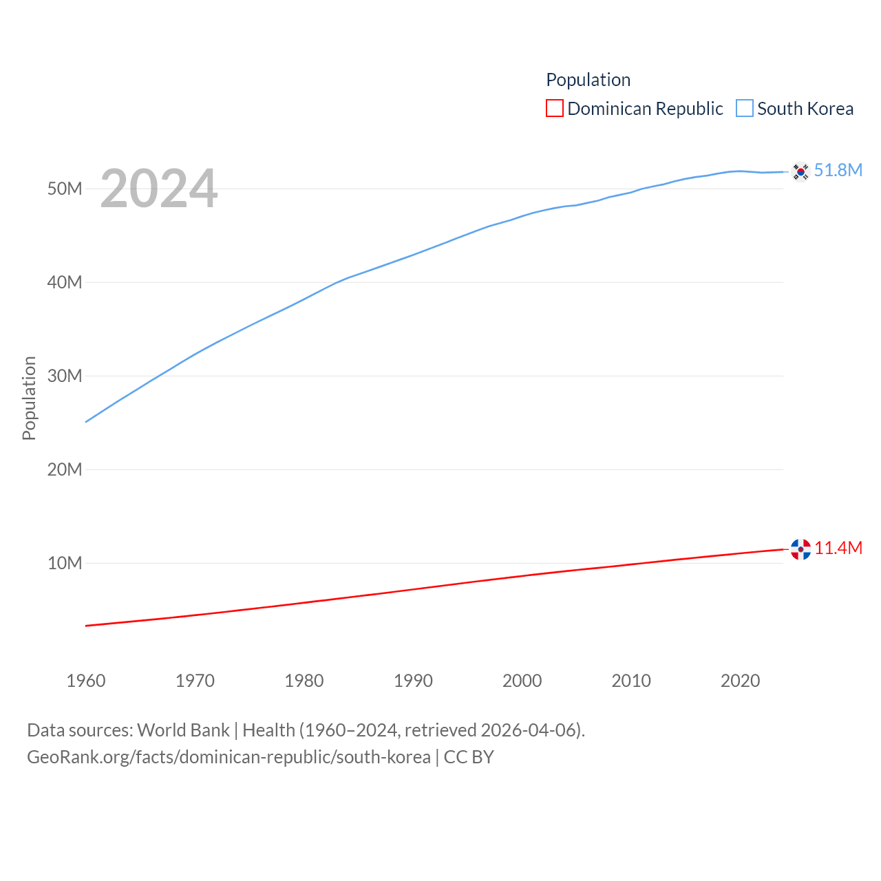 The Dominican Republic has a population of 11.4M (ranked 85/197), compared with 51.8M in South Korea (ranked 29/197). The Dominican Republic's land area is 18,609 sq mi versus 37,684 sq mi for South Korea (ranked 127th vs. 105th).