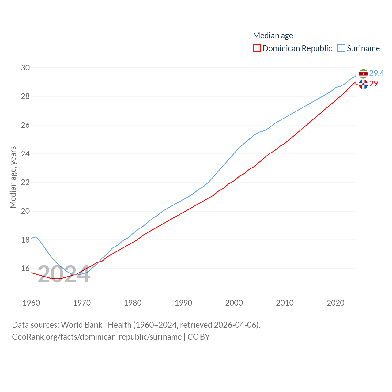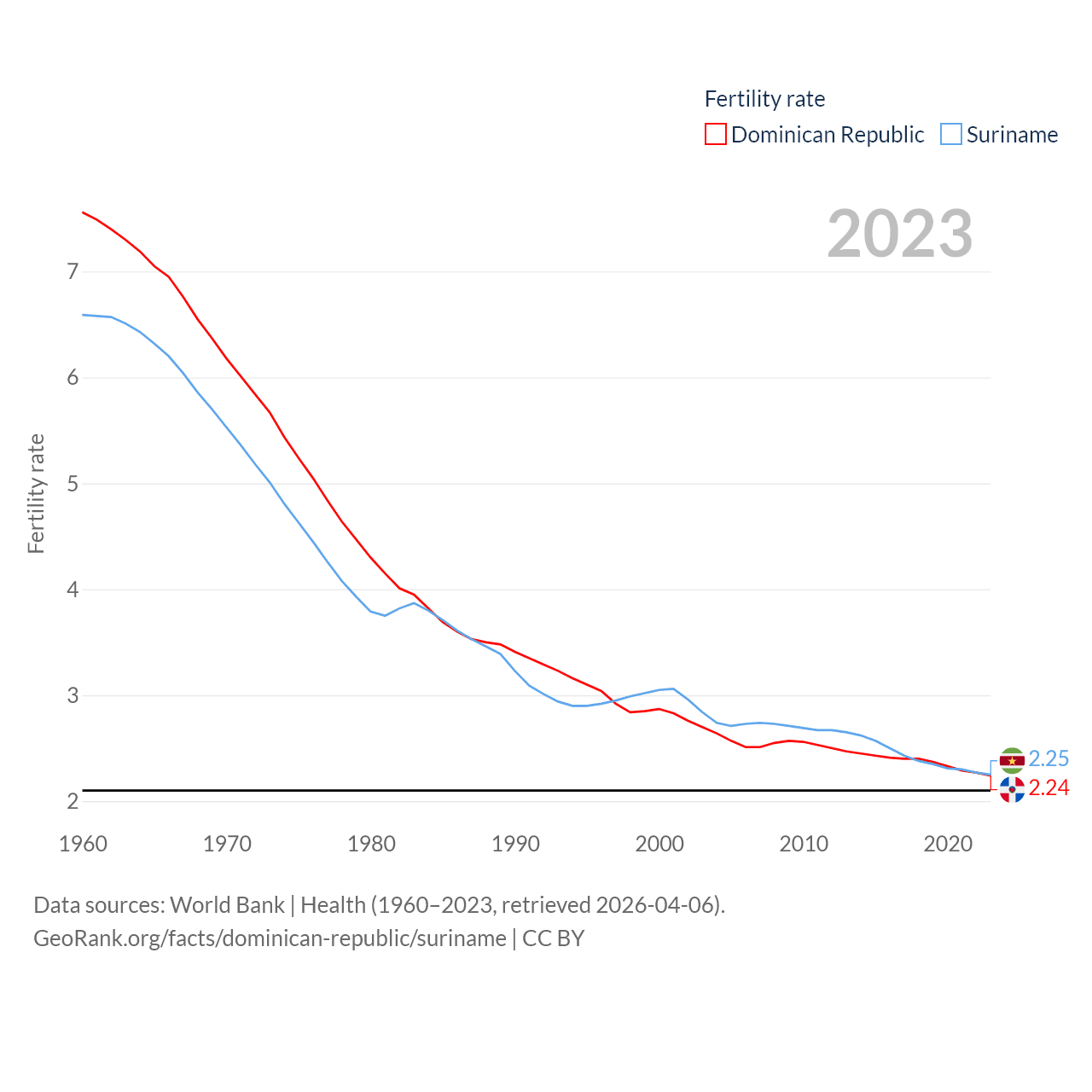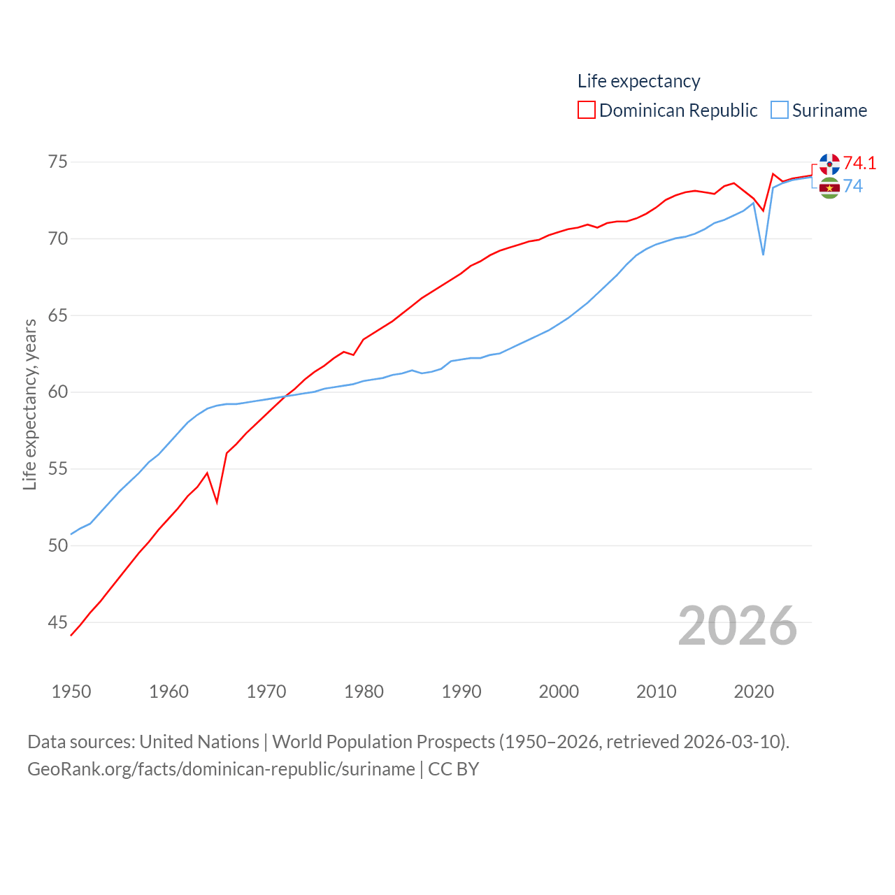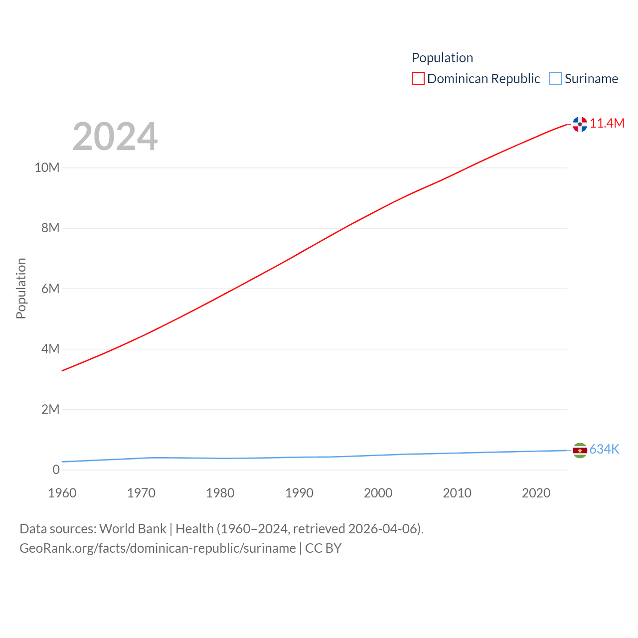 The Dominican Republic has a population of 11.4M (ranked 85/197), compared with 634K in Suriname (ranked 165/197). The Dominican Republic's land area is 18,609 sq mi versus 61,972 sq mi for Suriname (ranked 127th vs. 90th).
