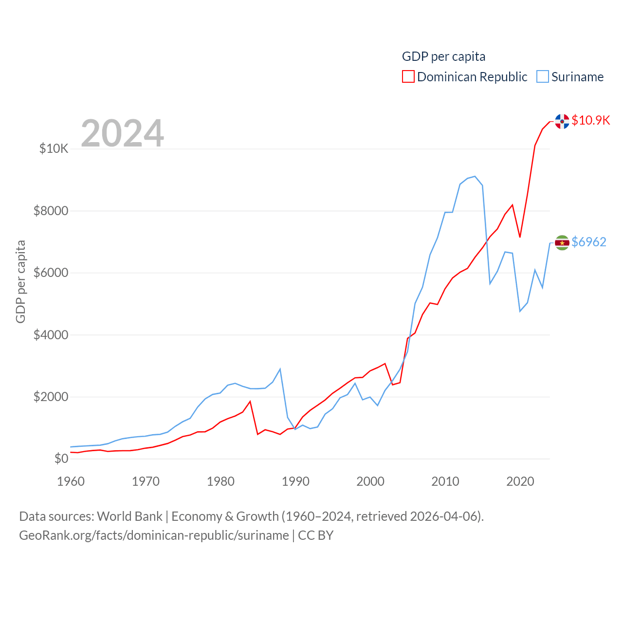 By GDP, The Dominican Republic ranks 63/197 ($124B) and Suriname ranks 164/197 ($4.42B). By GDP per capita, The Dominican Republic ranks 83/197 ($10,876), while Suriname ranks 102/197 ($6,962).