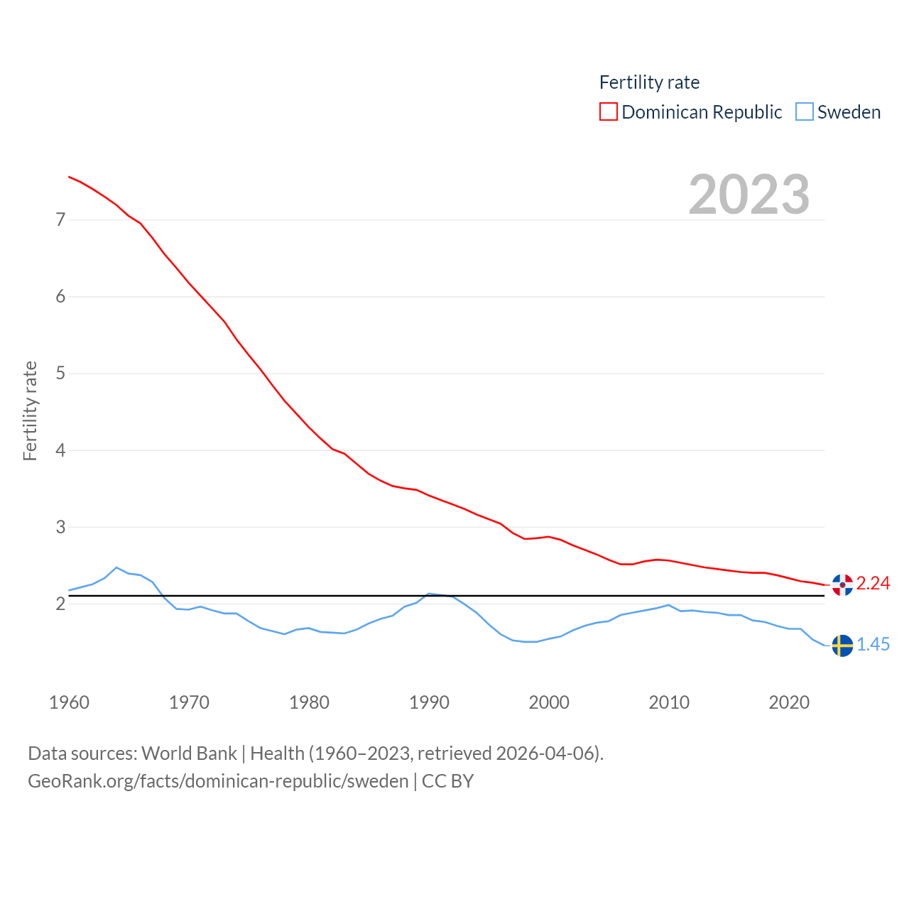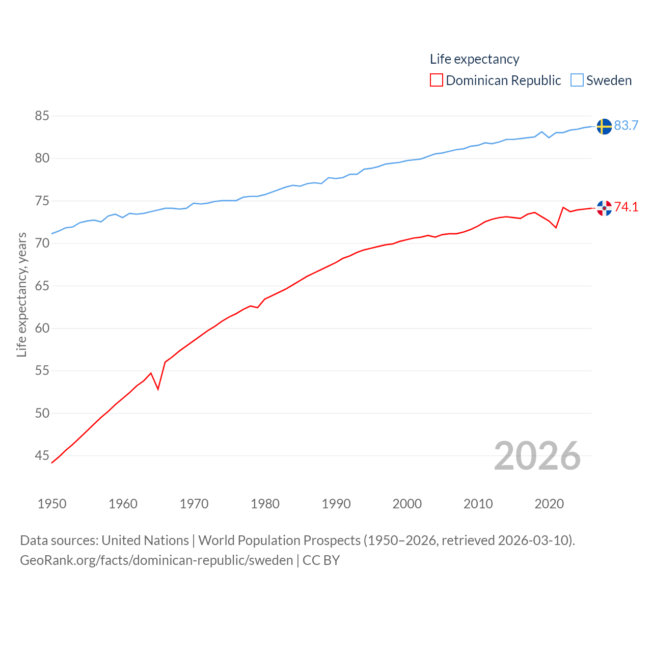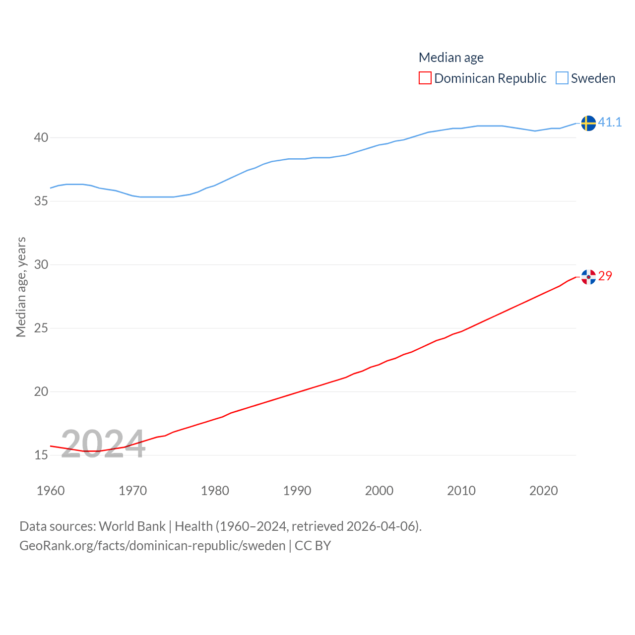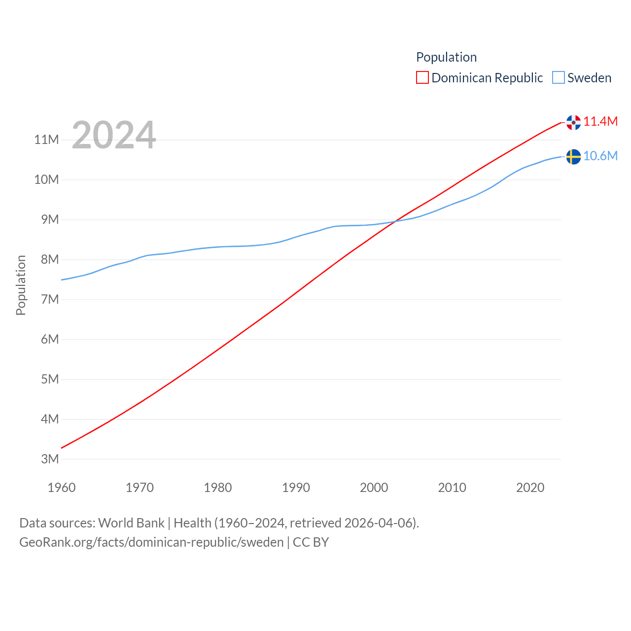 The Dominican Republic has a population of 11.4M (ranked 85/197), compared with 10.6M in Sweden (ranked 93/197). The Dominican Republic's land area is 18,609 sq mi versus 157,248 sq mi for Sweden (ranked 127th vs. 58th).