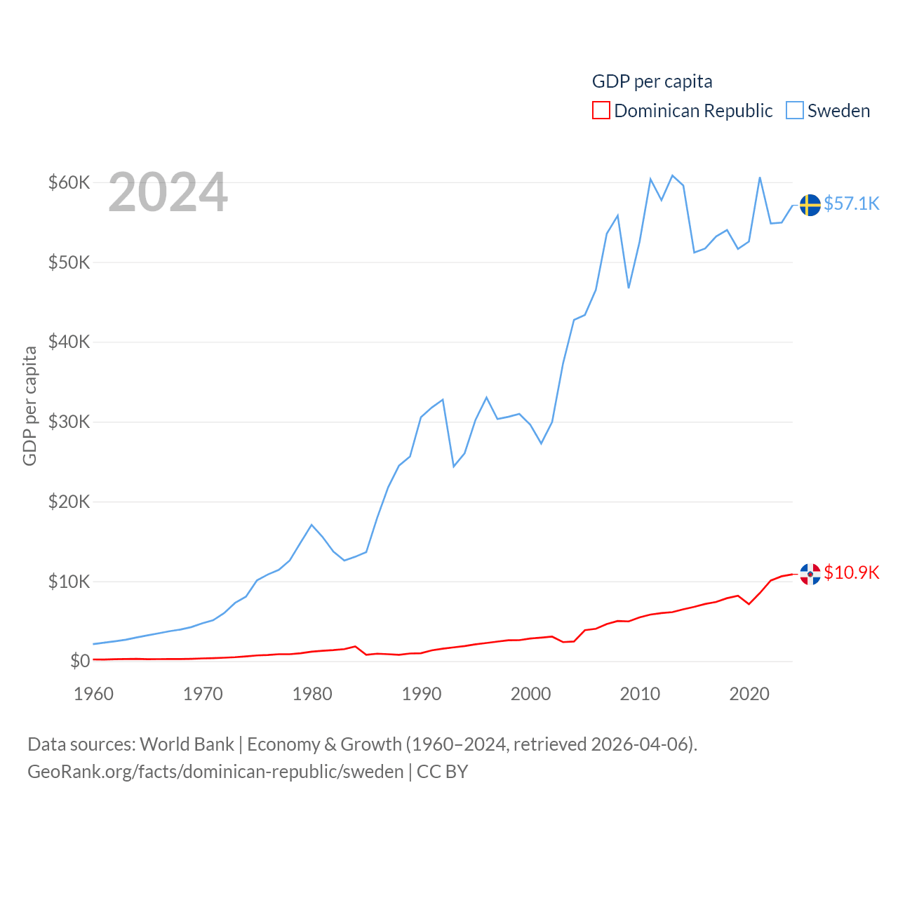 By GDP, The Dominican Republic ranks 63/197 ($124B) and Sweden ranks 26/197 ($604B). By GDP per capita, The Dominican Republic ranks 83/197 ($10,876), while Sweden ranks 17/197 ($57,117).