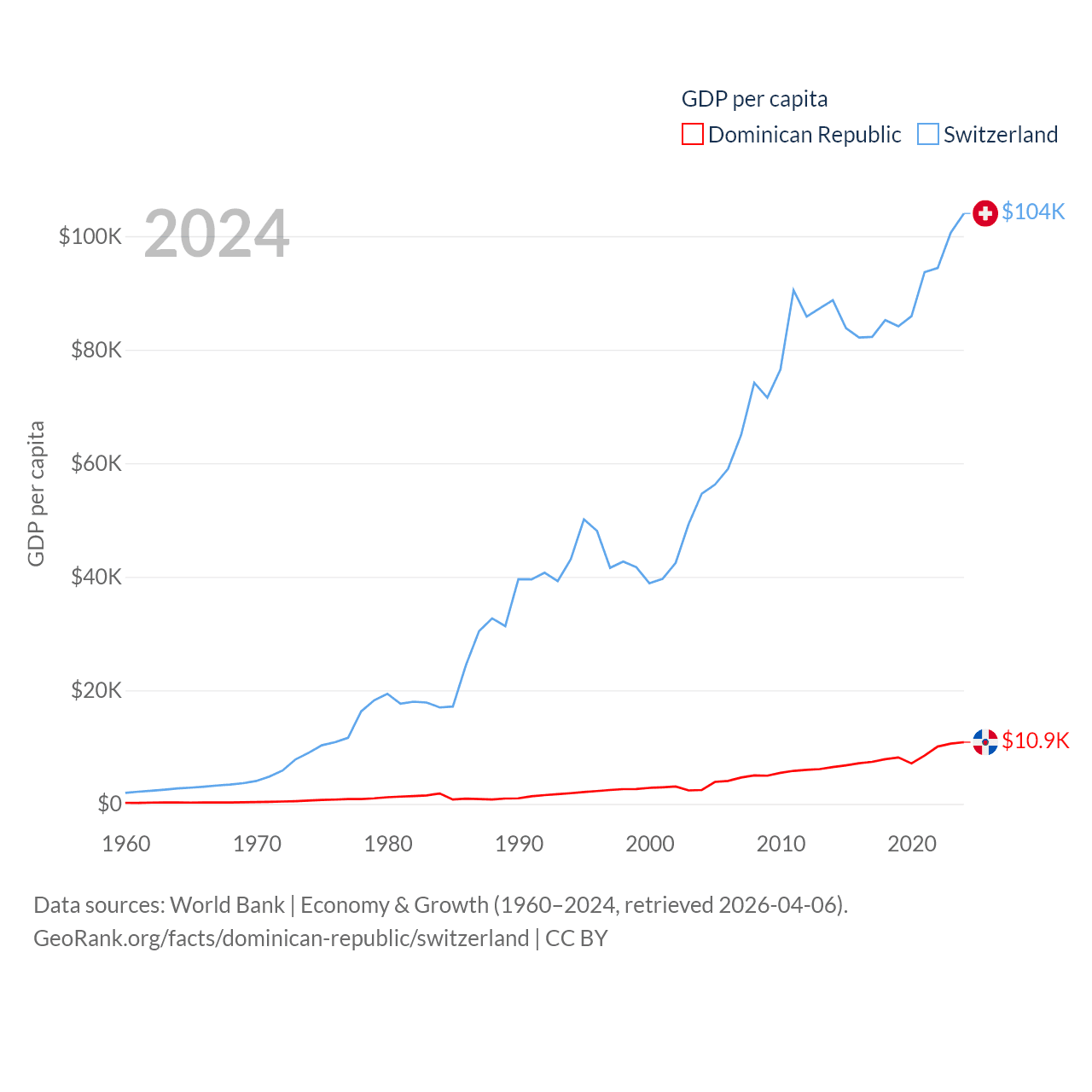 By GDP, The Dominican Republic ranks 63/197 ($124B) and Switzerland ranks 20/197 ($937B). By GDP per capita, The Dominican Republic ranks 83/197 ($10,876), while Switzerland ranks 5/197 ($103,998).