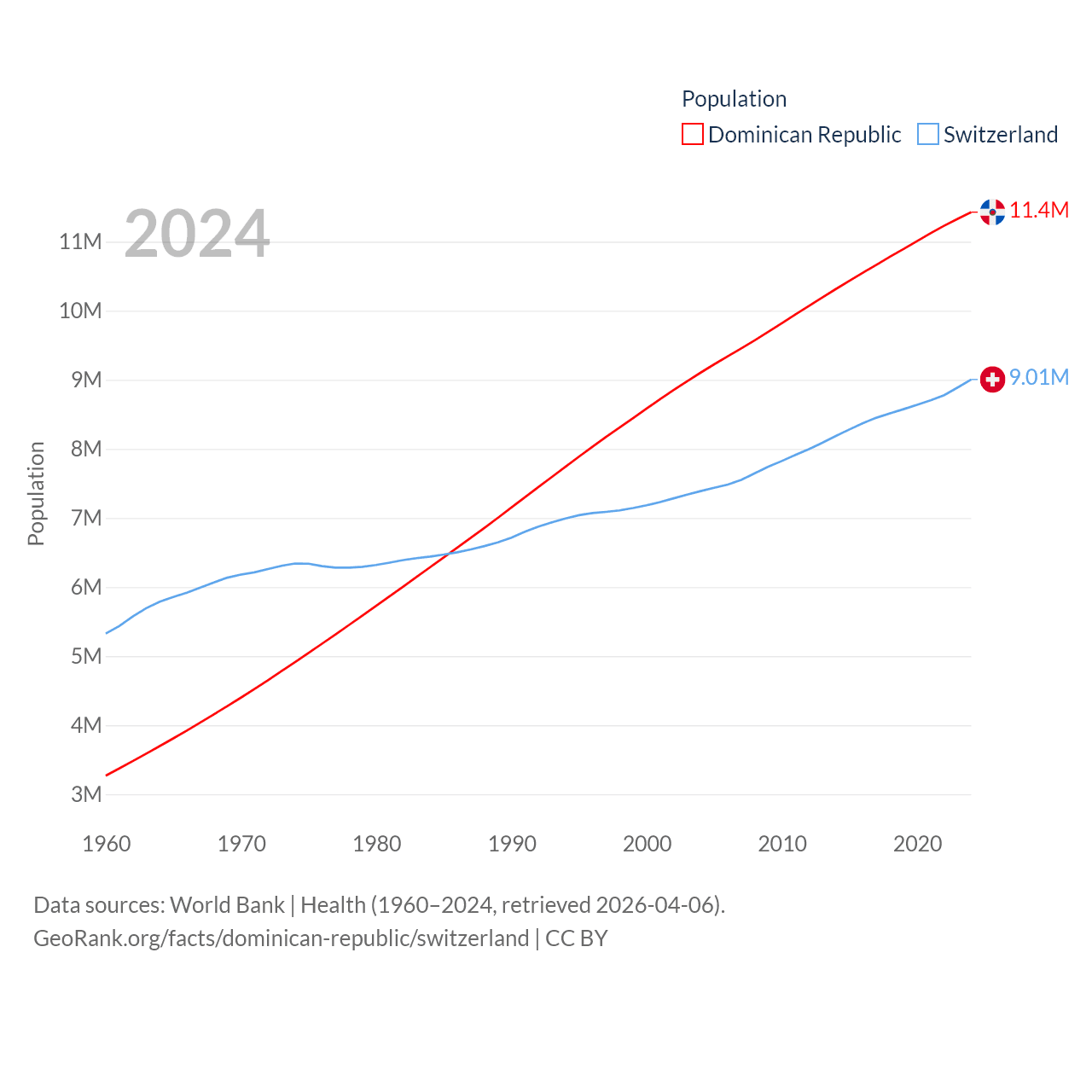 The Dominican Republic has a population of 11.4M (ranked 85/197), compared with 9.01M in Switzerland (ranked 101/197). The Dominican Republic's land area is 18,609 sq mi versus 15,255 sq mi for Switzerland (ranked 127th vs. 131st).