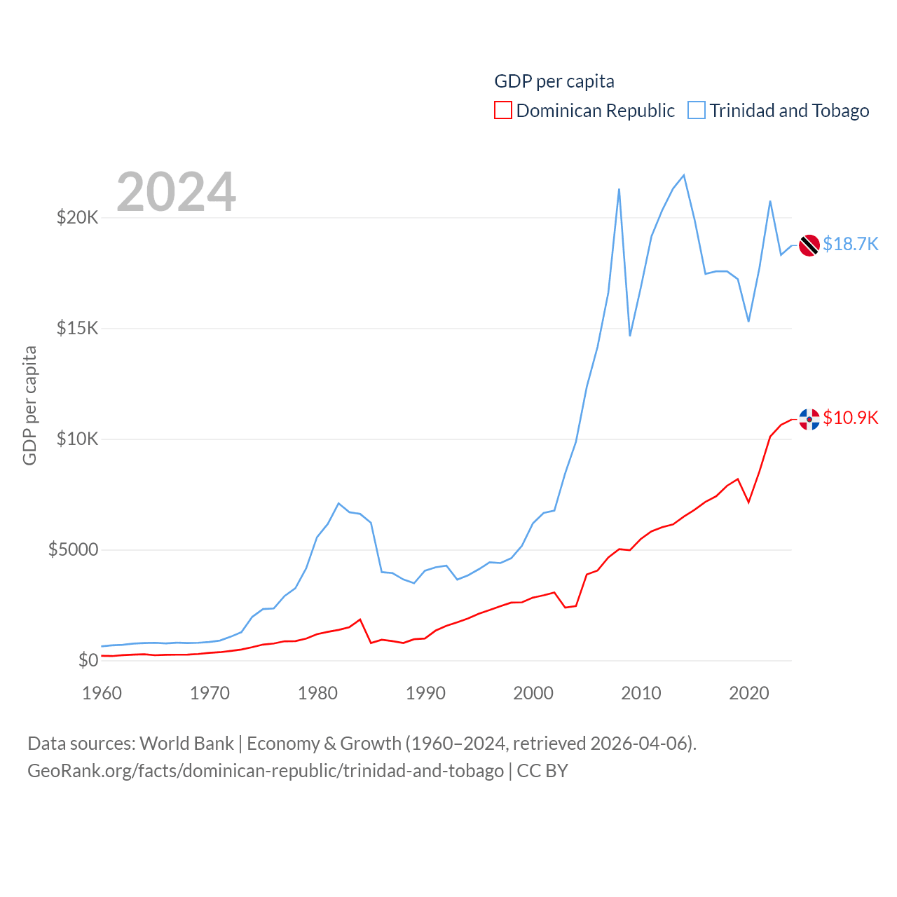 By GDP, The Dominican Republic ranks 63/197 ($124B) and Trinidad and Tobago ranks 115/197 ($25.6B). By GDP per capita, The Dominican Republic ranks 83/197 ($10,876), while Trinidad and Tobago ranks 61/197 ($18,733).