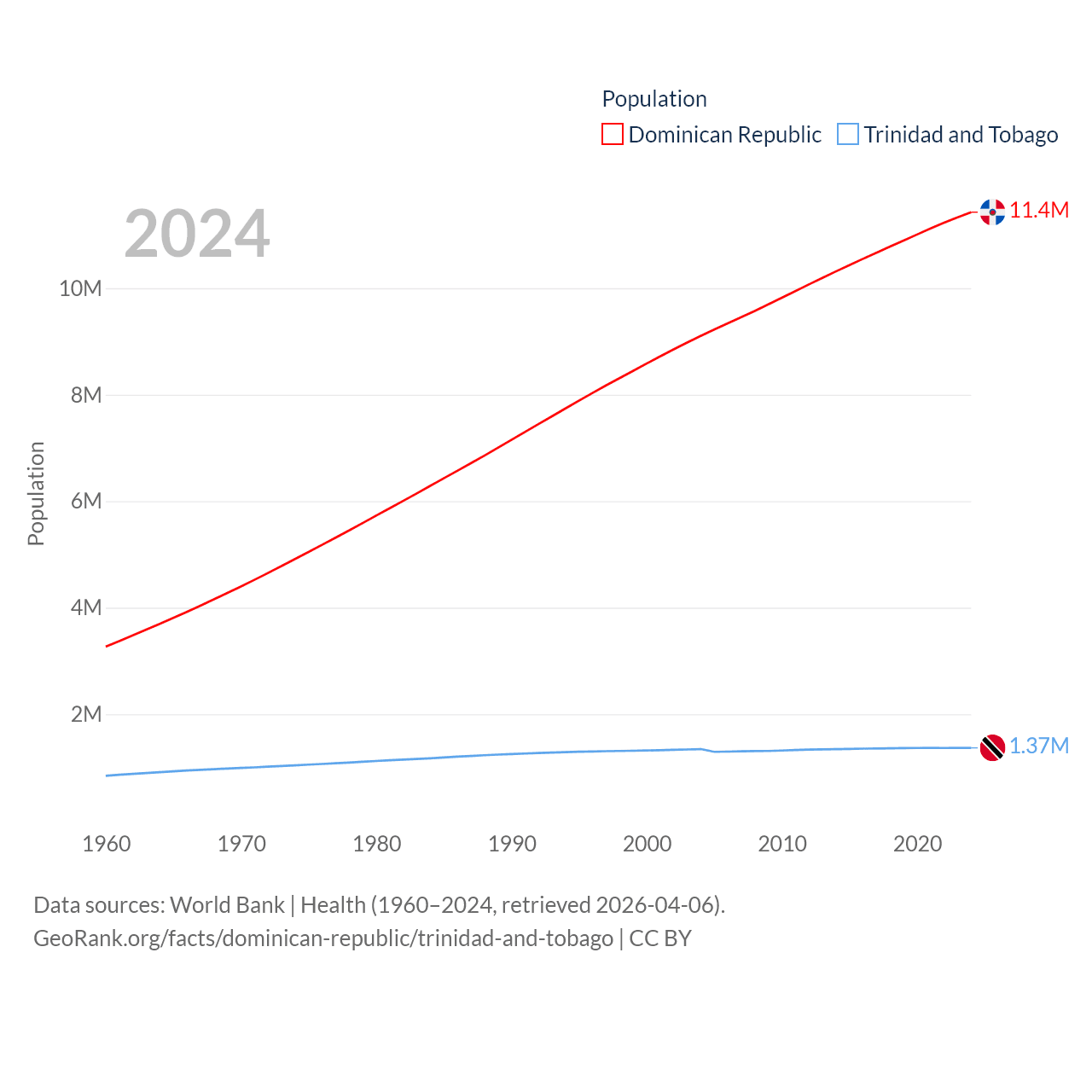 The Dominican Republic has a population of 11.4M (ranked 85/197), compared with 1.37M in Trinidad and Tobago (ranked 154/197). The Dominican Republic's land area is 18,609 sq mi versus 1,981 sq mi for Trinidad and Tobago (ranked 127th vs. 166th).