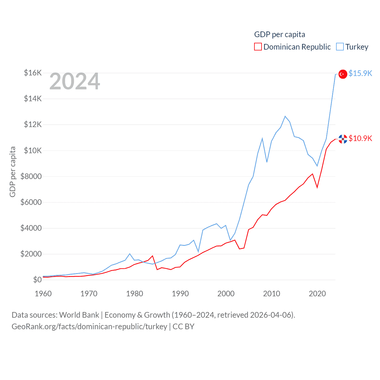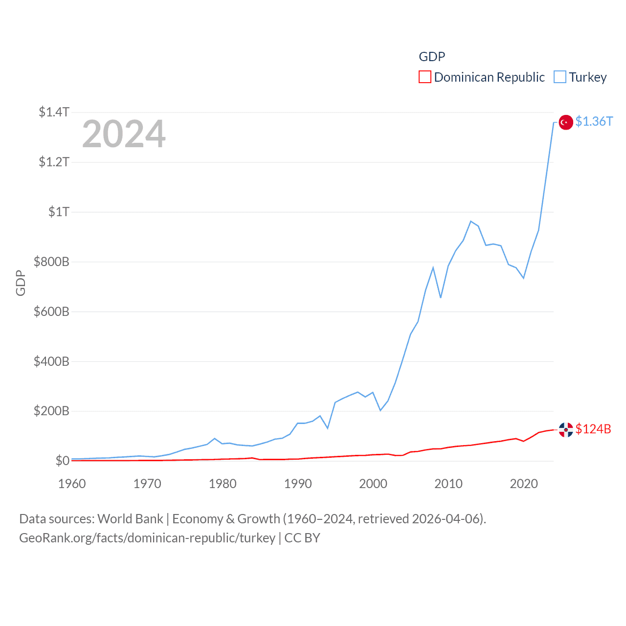 By GDP, The Dominican Republic ranks 63/197 ($124B) and Turkey ranks 17/197 ($1.36T). By GDP per capita, The Dominican Republic ranks 83/197 ($10,876), while Turkey ranks 66/197 ($15,893).