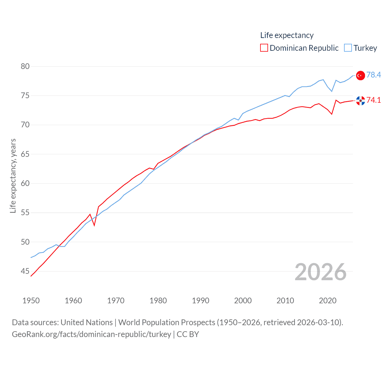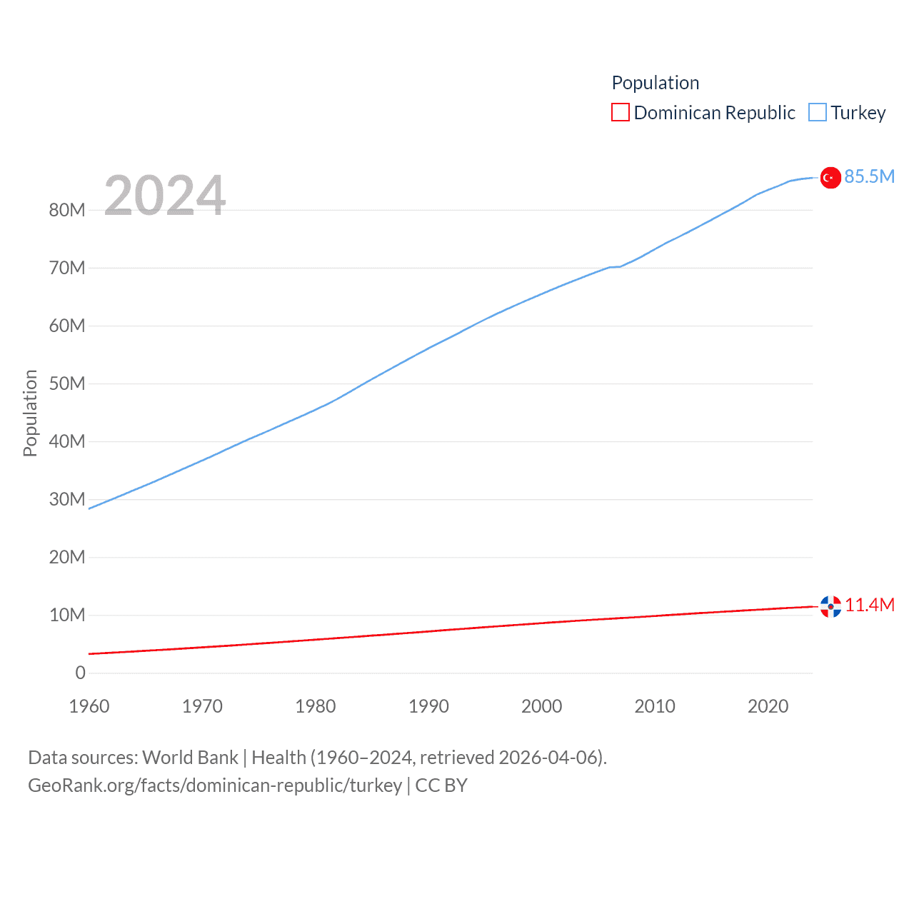 The Dominican Republic has a population of 11.4M (ranked 85/197), compared with 85.5M in Turkey (ranked 18/197). The Dominican Republic's land area is 18,609 sq mi versus 297,156 sq mi for Turkey (ranked 127th vs. 36th).