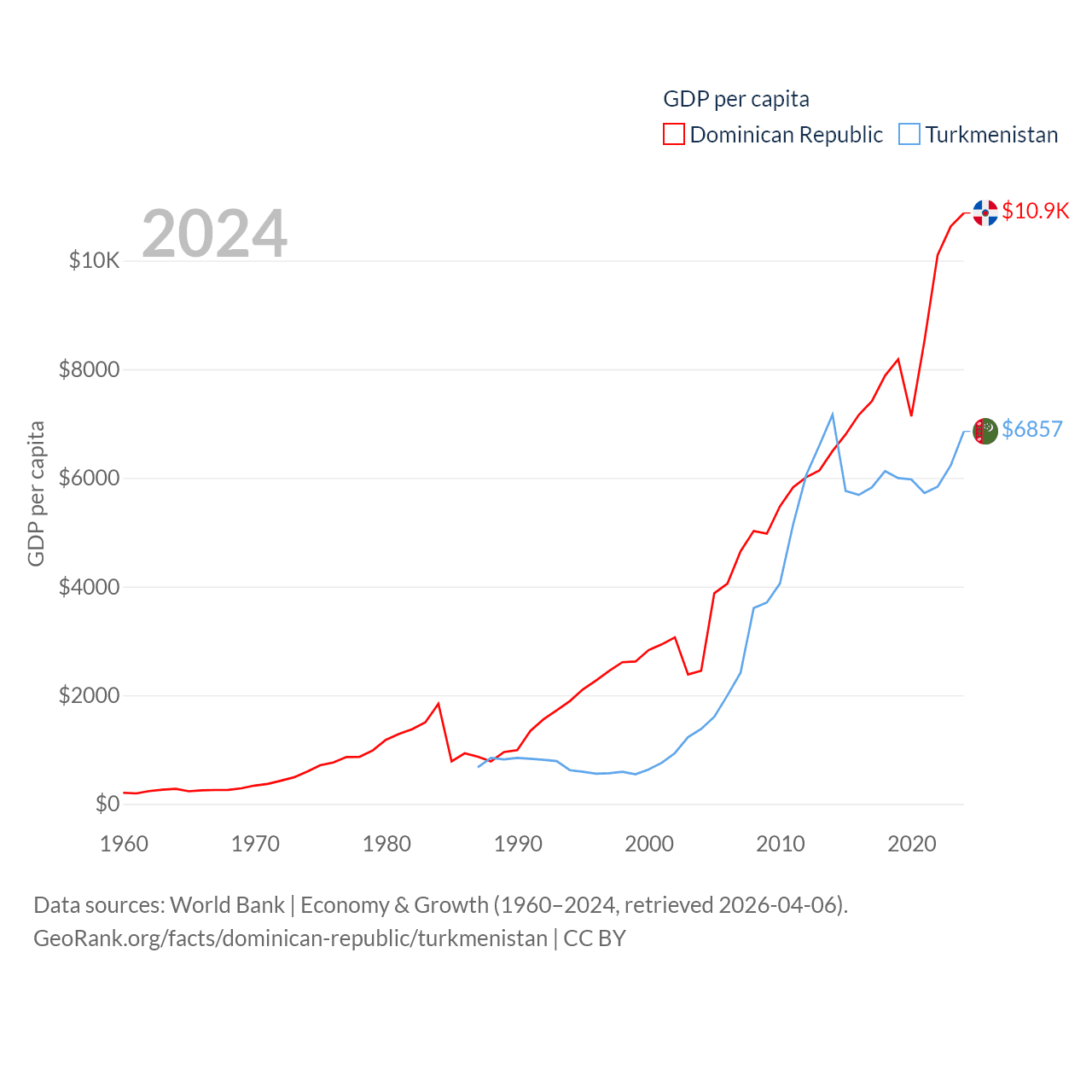 By GDP, The Dominican Republic ranks 63/197 ($124B) and Turkmenistan ranks 92/197 ($51.4B). By GDP per capita, The Dominican Republic ranks 83/197 ($10,876), while Turkmenistan ranks 104/197 ($6,857).