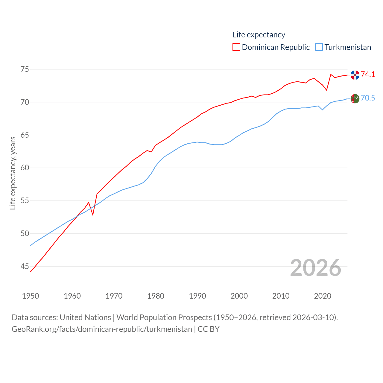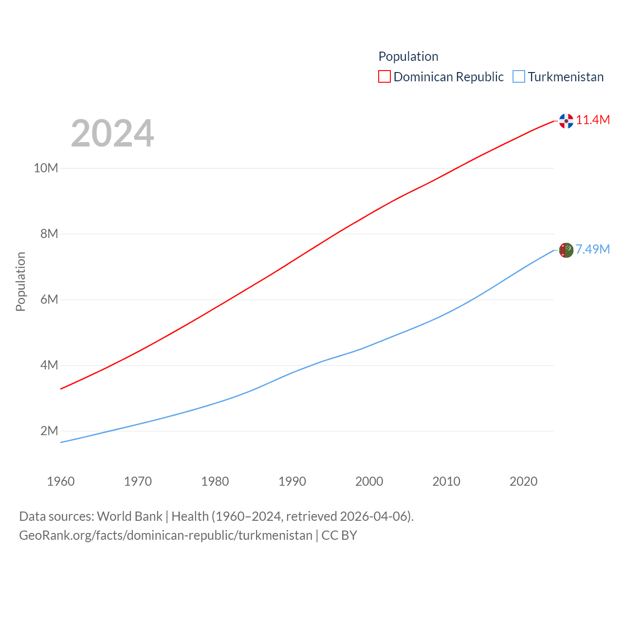 The Dominican Republic has a population of 11.4M (ranked 85/197), compared with 7.49M in Turkmenistan (ranked 104/197). The Dominican Republic's land area is 18,609 sq mi versus 181,441 sq mi for Turkmenistan (ranked 127th vs. 53rd).