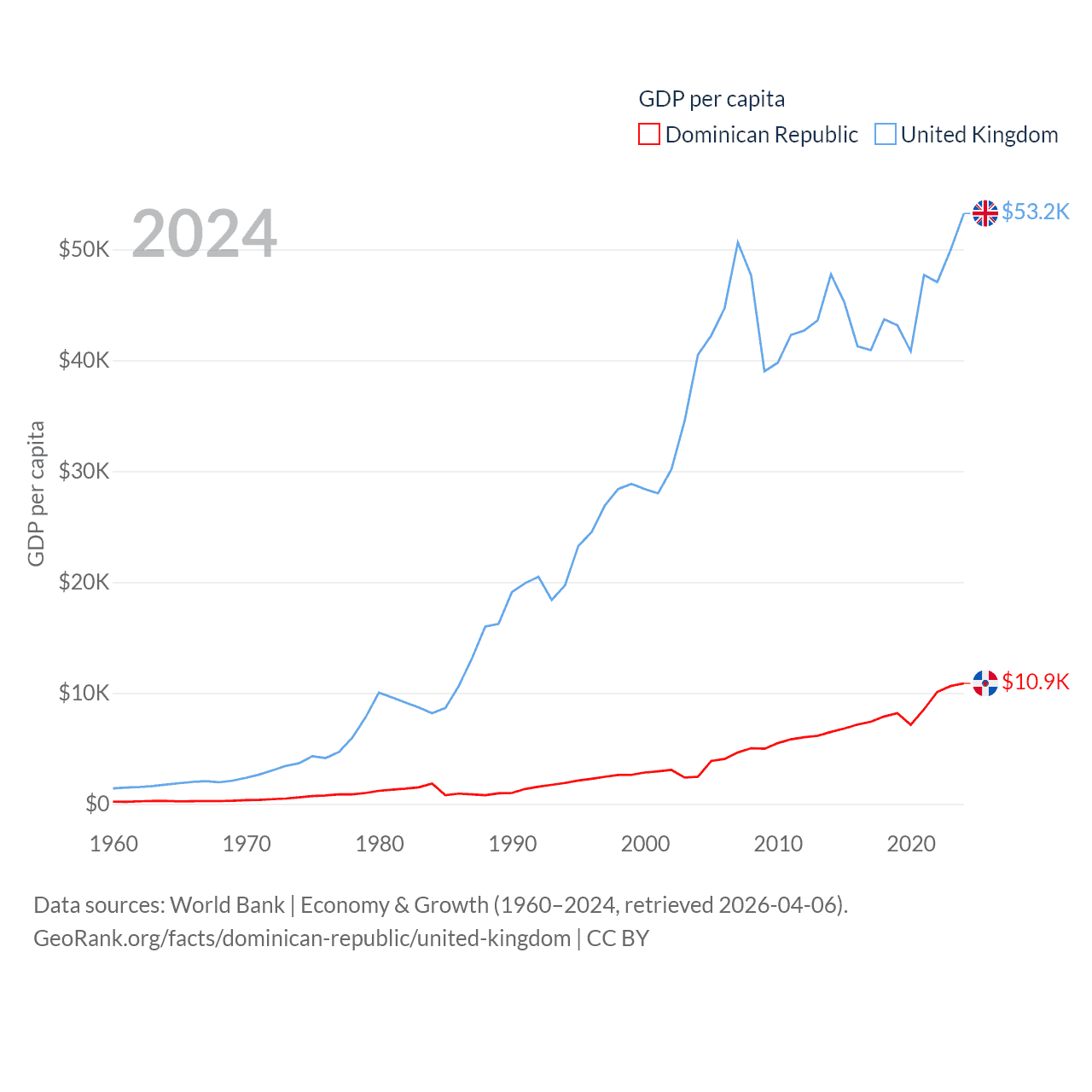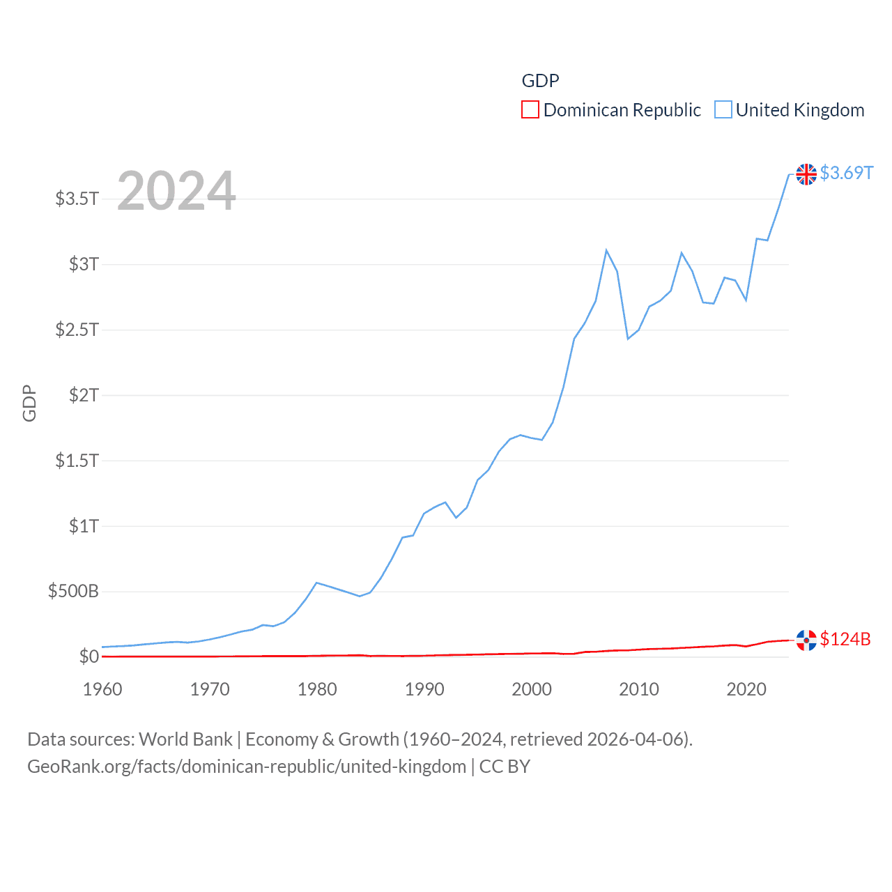 By GDP, The Dominican Republic ranks 63/197 ($124B) and The United Kingdom ranks 6/197 ($3.69T). By GDP per capita, The Dominican Republic ranks 83/197 ($10,876), while The United Kingdom ranks 22/197 ($53,246).