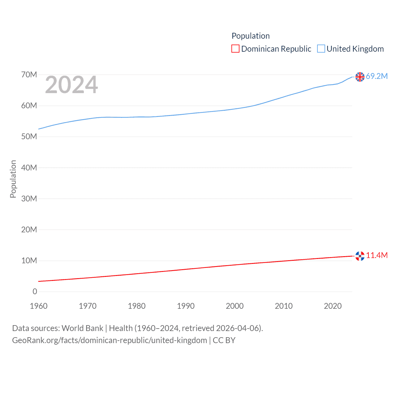 The Dominican Republic has a population of 11.4M (ranked 85/197), compared with 69.2M in The United Kingdom (ranked 21/197). The Dominican Republic's land area is 18,609 sq mi versus 93,410 sq mi for The United Kingdom (ranked 127th vs. 78th).