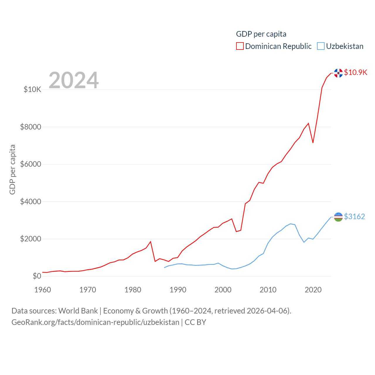 By GDP, The Dominican Republic ranks 63/197 ($124B) and Uzbekistan ranks 66/197 ($115B). By GDP per capita, The Dominican Republic ranks 83/197 ($10,876), while Uzbekistan ranks 139/197 ($3,162).