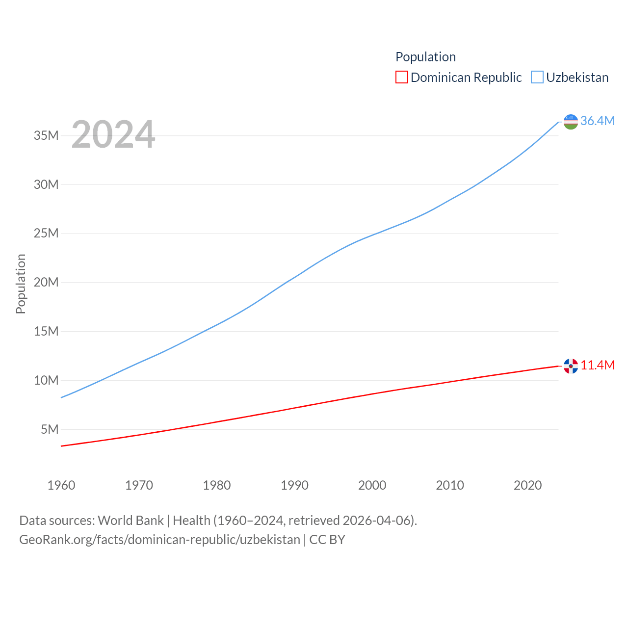 The Dominican Republic has a population of 11.4M (ranked 85/197), compared with 36.4M in Uzbekistan (ranked 43/197). The Dominican Republic's land area is 18,609 sq mi versus 170,136 sq mi for Uzbekistan (ranked 127th vs. 56th).