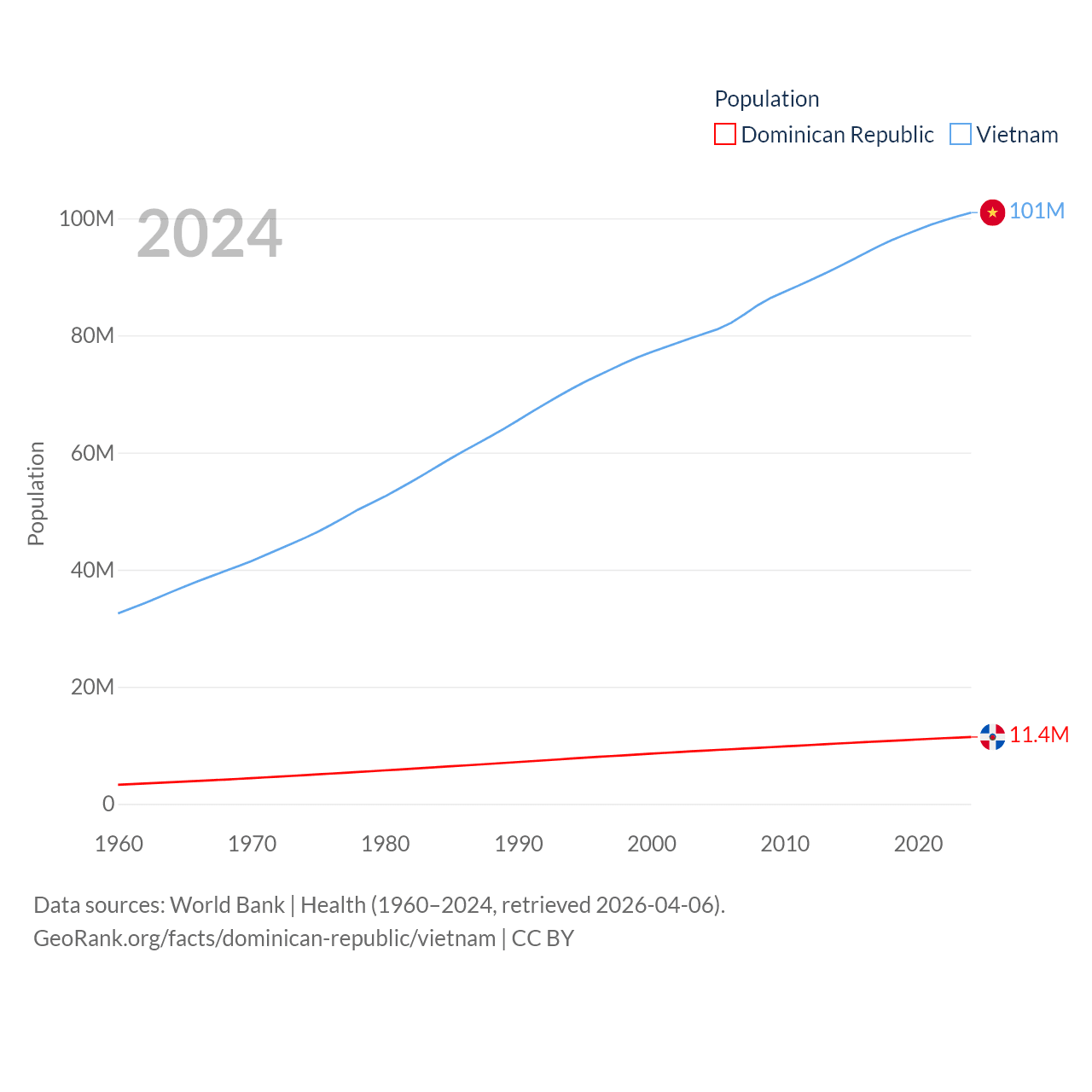 The Dominican Republic has a population of 11.4M (ranked 85/197), compared with 101M in Vietnam (ranked 16/197). The Dominican Republic's land area is 18,609 sq mi versus 121,016 sq mi for Vietnam (ranked 127th vs. 67th).