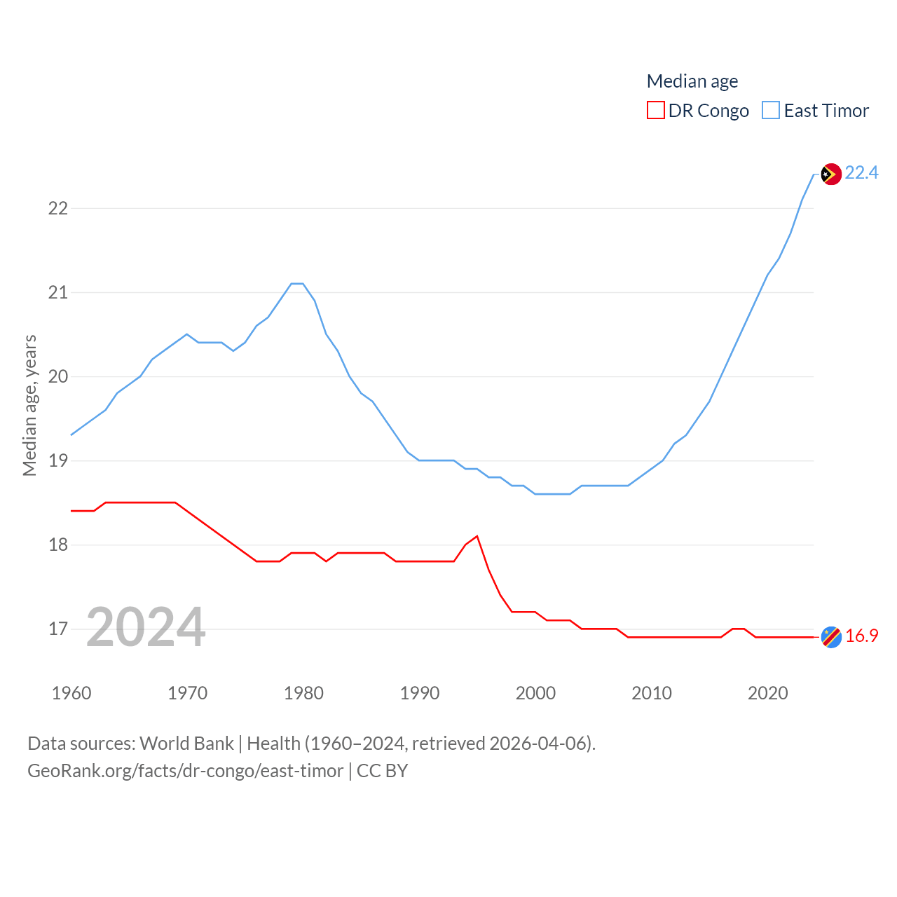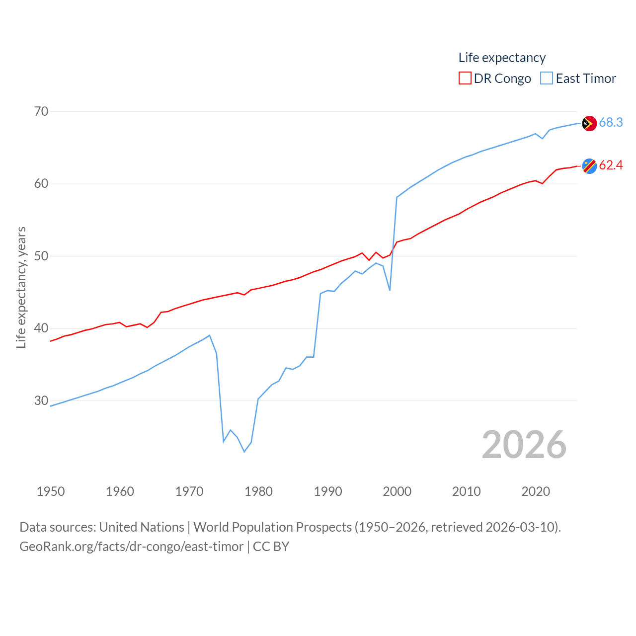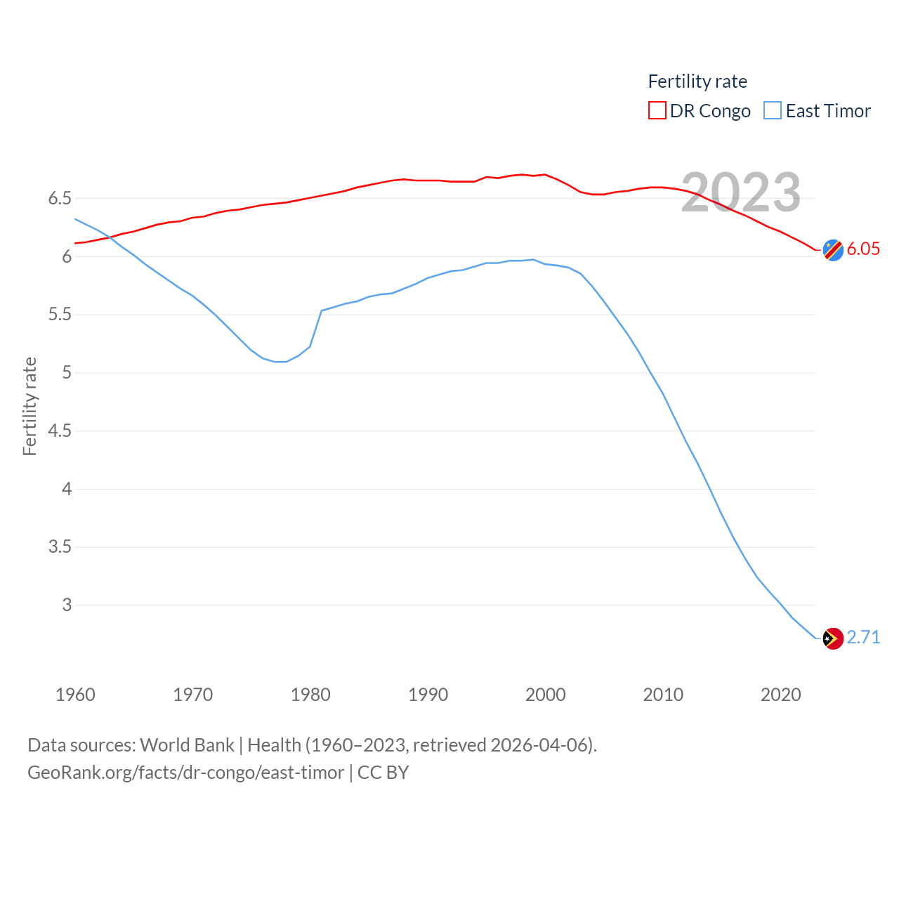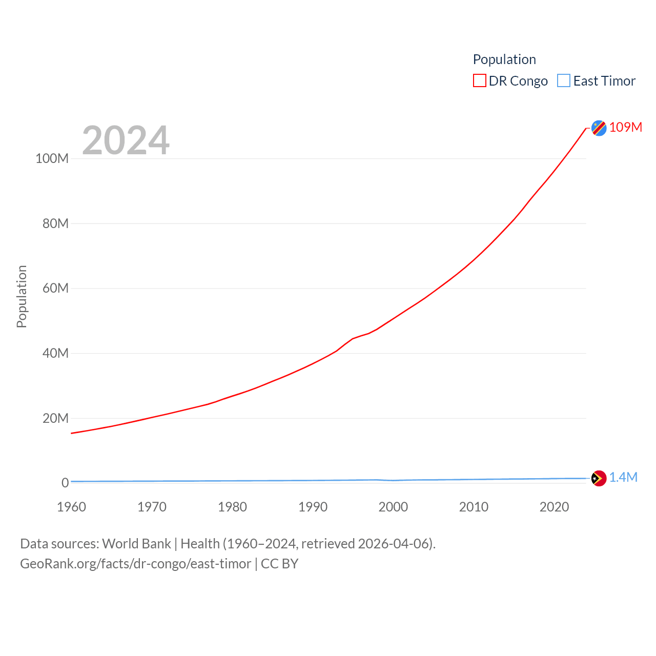 The DR Congo has a population of 109M (ranked 15/197), compared with 1.4M in East Timor (ranked 152/197). The DR Congo's land area is 875,313 sq mi versus 5,741 sq mi for East Timor (ranked 11th vs. 155th).