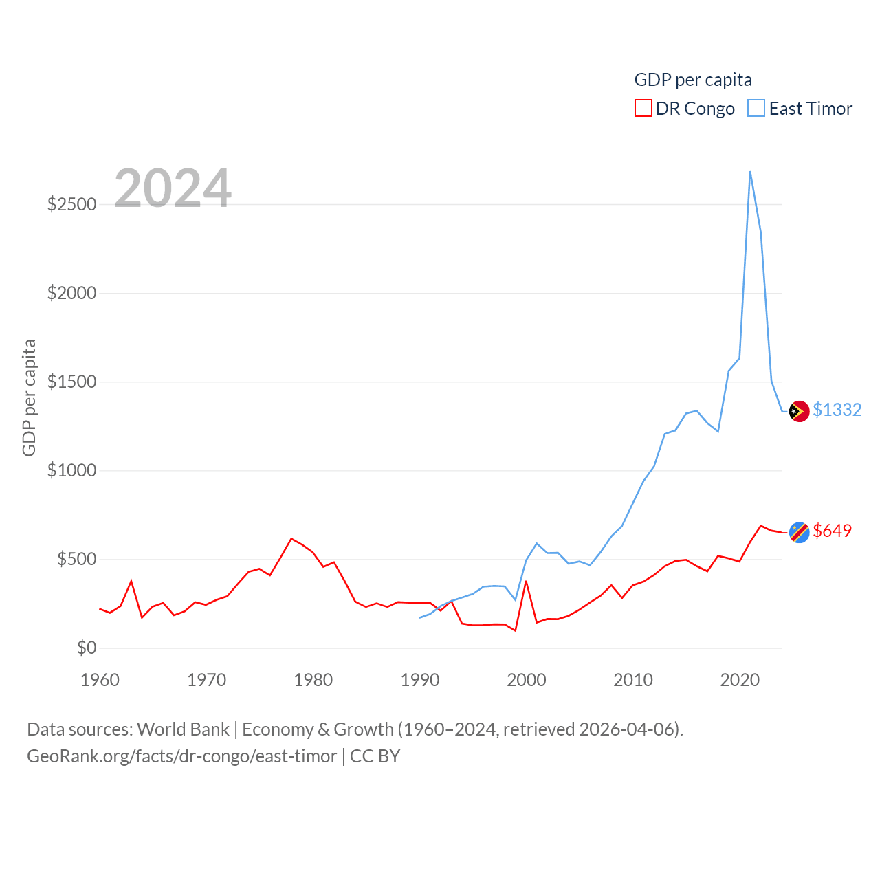 By GDP, The DR Congo ranks 87/197 ($71B) and East Timor ranks 181/197 ($1.87B). By GDP per capita, The DR Congo ranks 190/197 ($649), while East Timor ranks 167/197 ($1,332).
