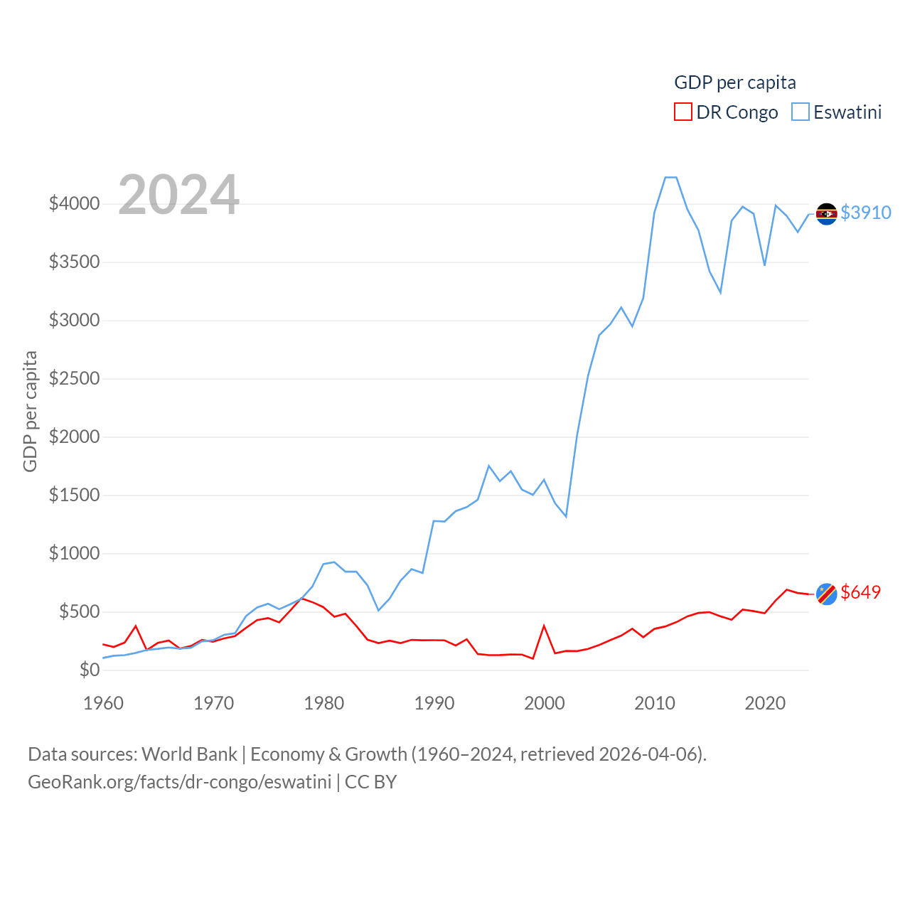 By GDP, The DR Congo ranks 87/197 ($71B) and Eswatini ranks 162/197 ($4.86B). By GDP per capita, The DR Congo ranks 190/197 ($649), while Eswatini ranks 131/197 ($3,910).
