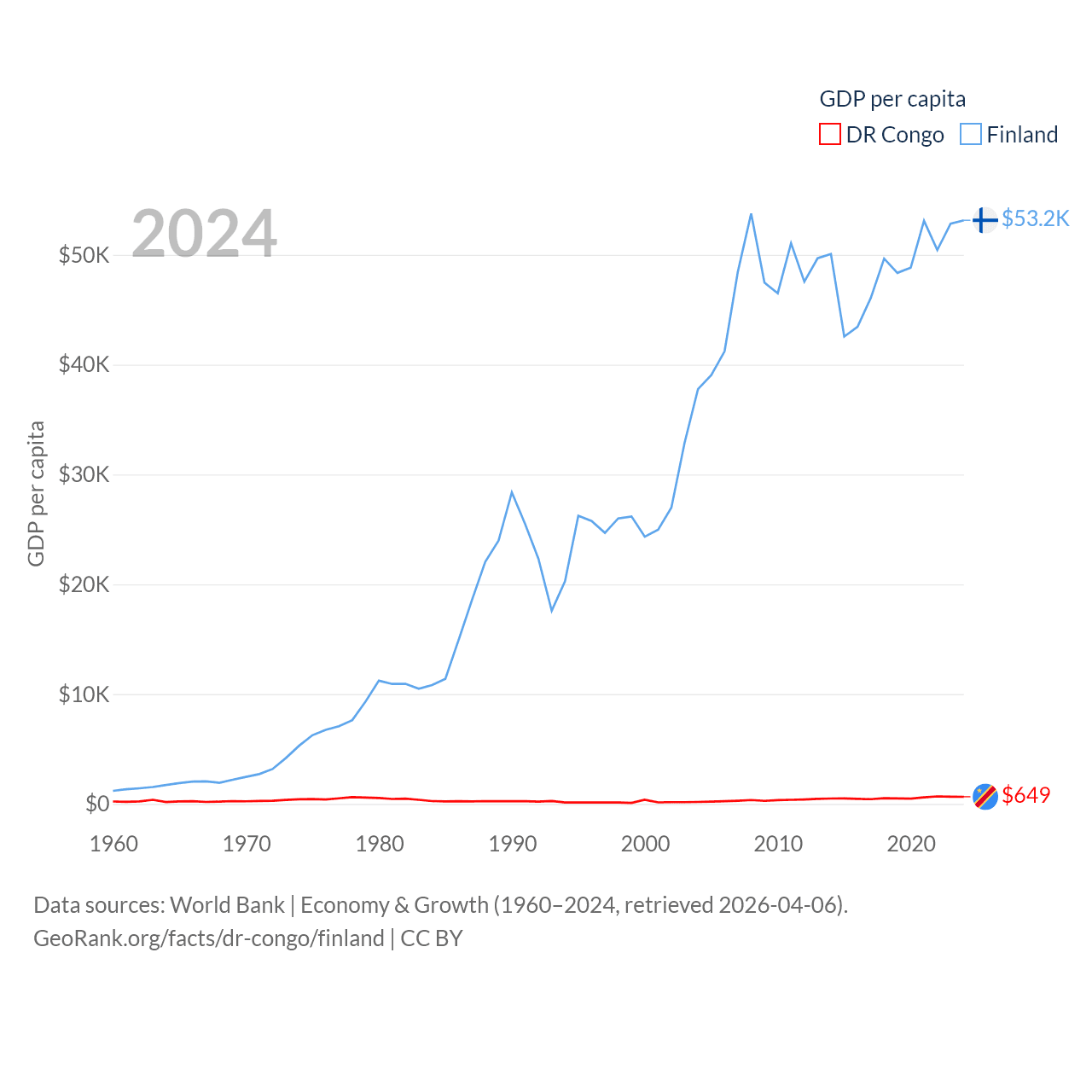 By GDP, The DR Congo ranks 87/197 ($71B) and Finland ranks 47/197 ($299B). By GDP per capita, The DR Congo ranks 190/197 ($649), while Finland ranks 23/197 ($53,150).