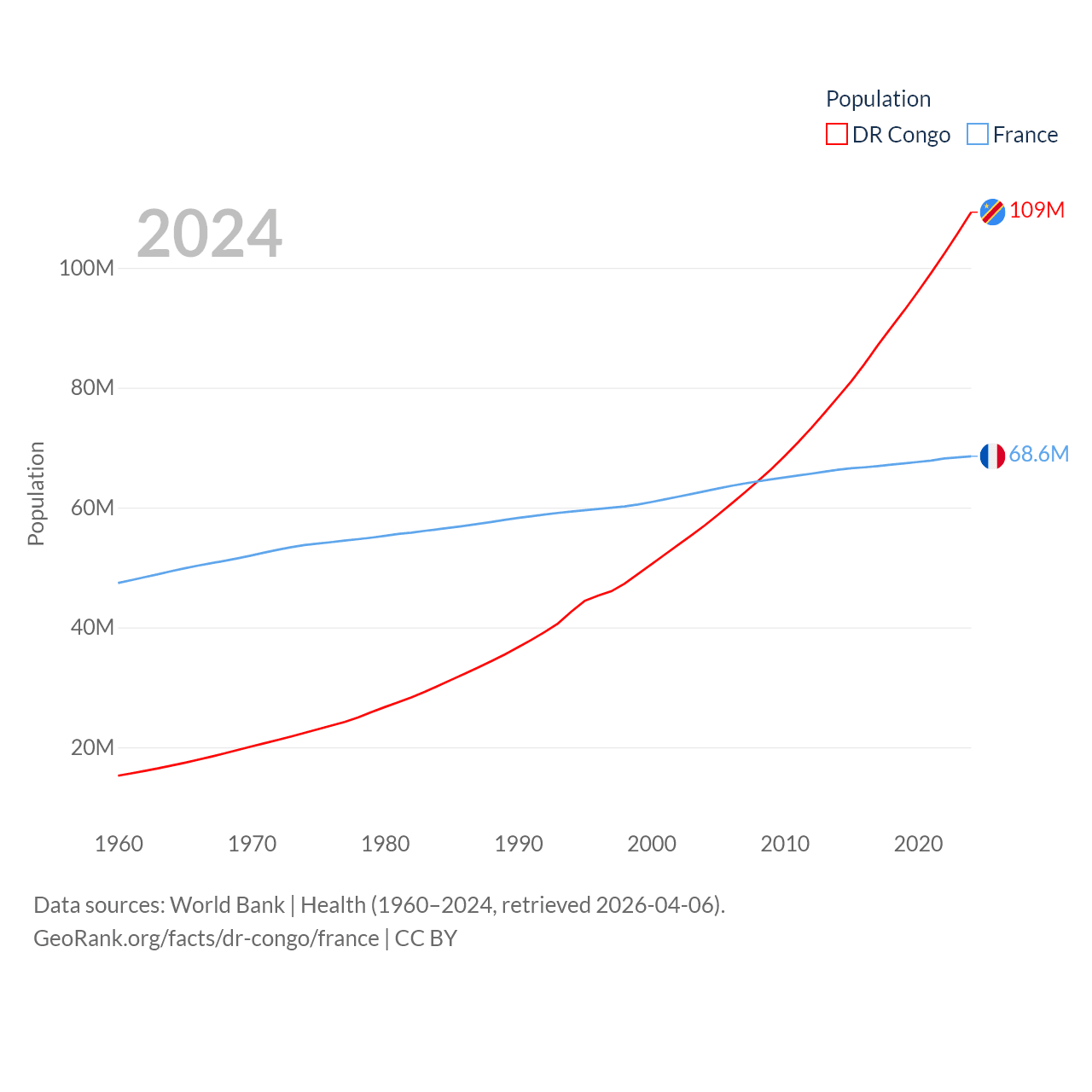The DR Congo has a population of 109M (ranked 15/197), compared with 68.6M in France (ranked 23/197). The DR Congo's land area is 875,313 sq mi versus 208,090 sq mi for France (ranked 11th vs. 48th).