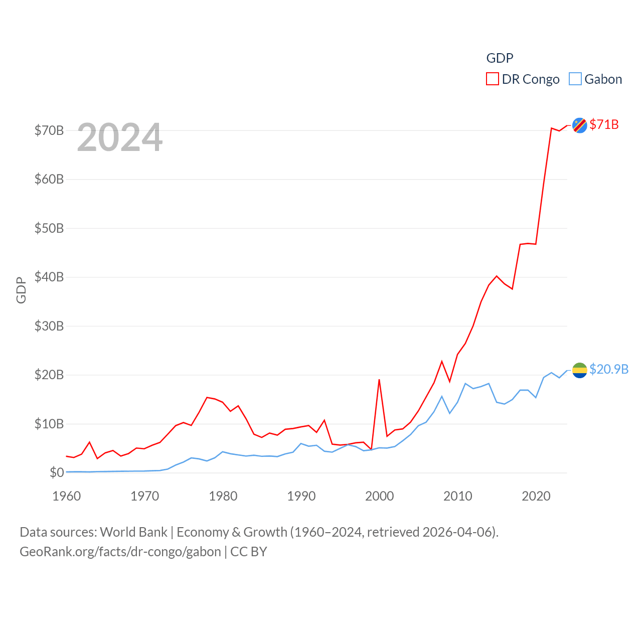 By GDP, The DR Congo ranks 87/197 ($71B) and Gabon ranks 127/197 ($20.9B). By GDP per capita, The DR Congo ranks 190/197 ($649), while Gabon ranks 93/197 ($8,230).