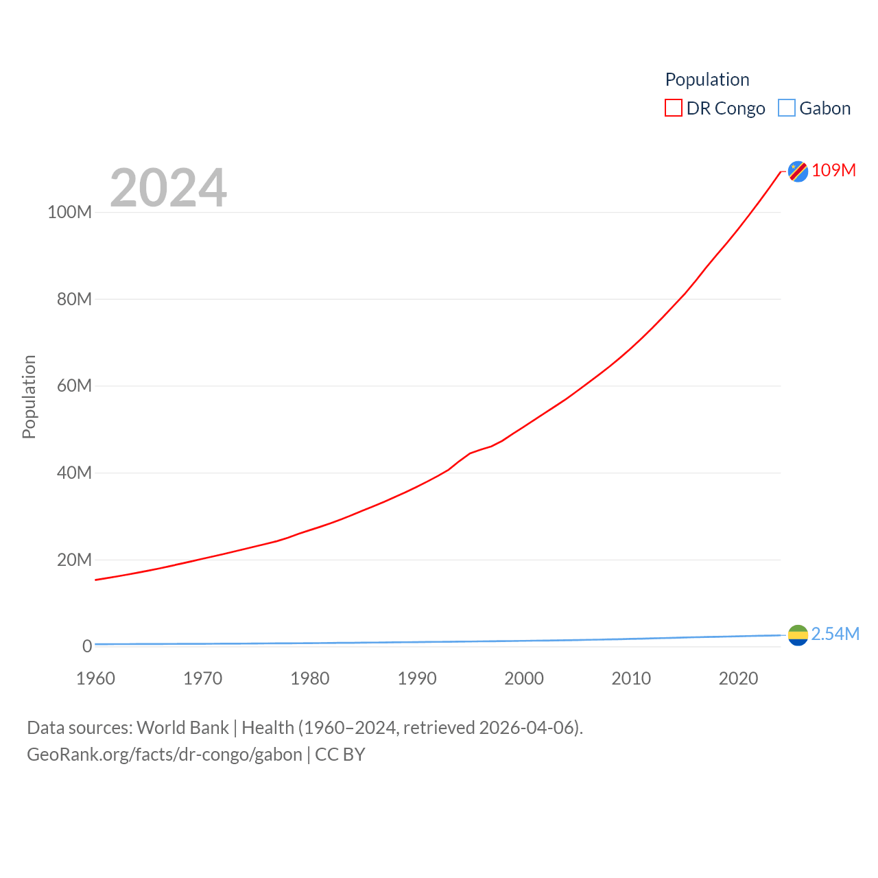 The DR Congo has a population of 109M (ranked 15/197), compared with 2.54M in Gabon (ranked 141/197). The DR Congo's land area is 875,313 sq mi versus 99,487 sq mi for Gabon (ranked 11th vs. 75th).