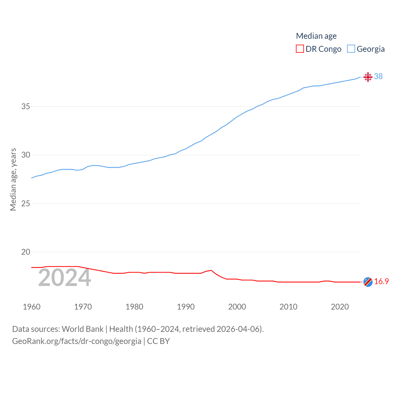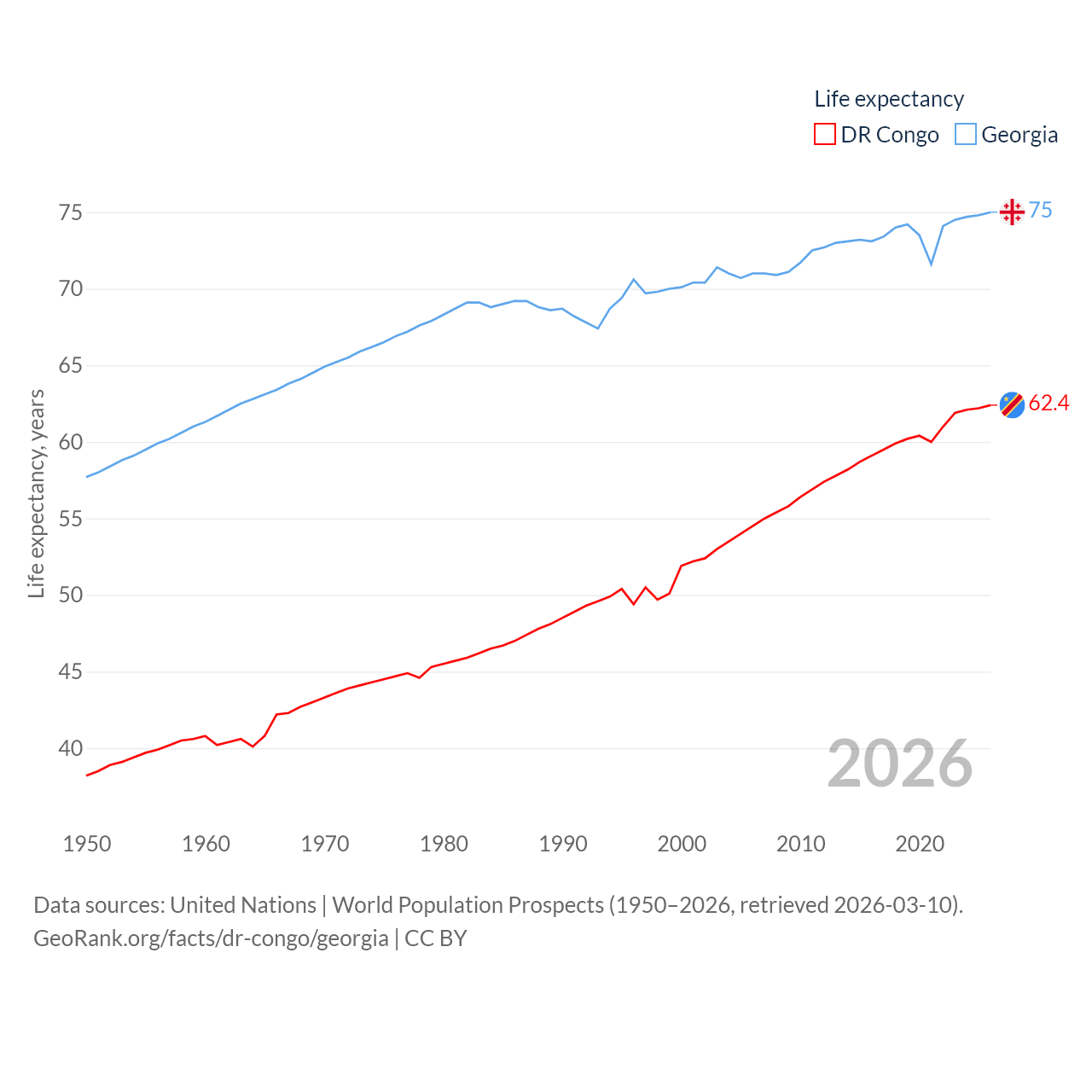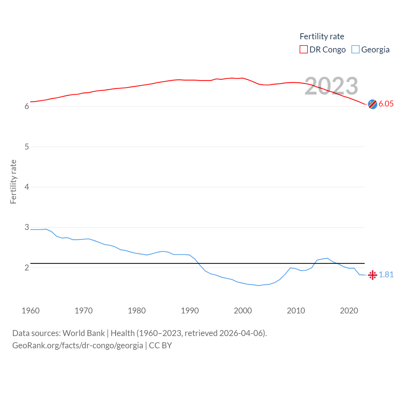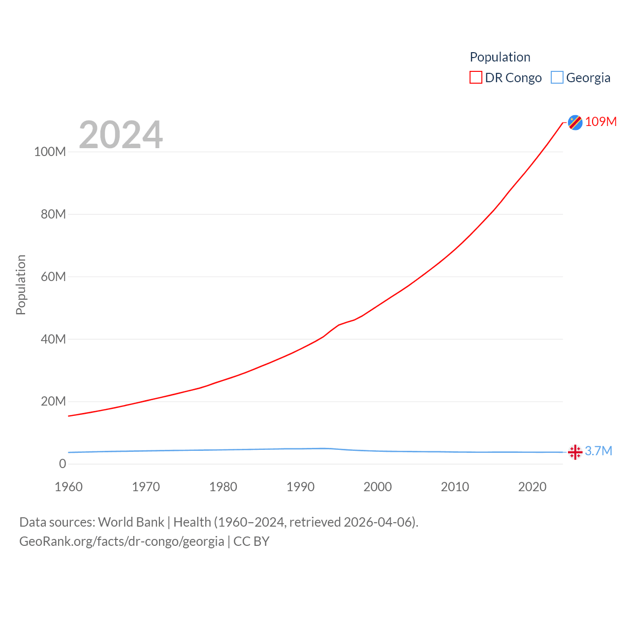 The DR Congo has a population of 109M (ranked 15/197), compared with 3.7M in Georgia (ranked 130/197). The DR Congo's land area is 875,313 sq mi versus 26,830 sq mi for Georgia (ranked 11th vs. 118th).
