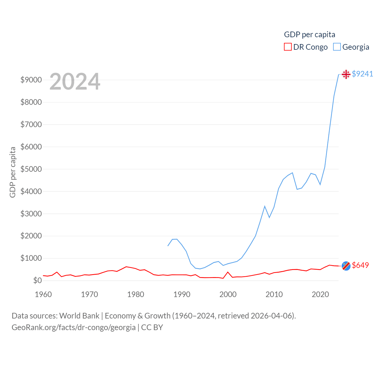 By GDP, The DR Congo ranks 87/197 ($71B) and Georgia ranks 107/197 ($34.2B). By GDP per capita, The DR Congo ranks 190/197 ($649), while Georgia ranks 89/197 ($9,241).