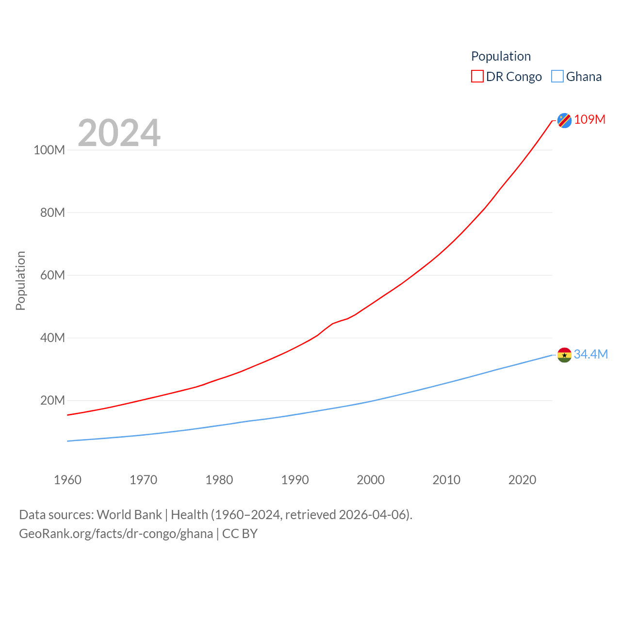 The DR Congo has a population of 109M (ranked 15/197), compared with 34.4M in Ghana (ranked 47/197). The DR Congo's land area is 875,313 sq mi versus 87,851 sq mi for Ghana (ranked 11th vs. 81st).