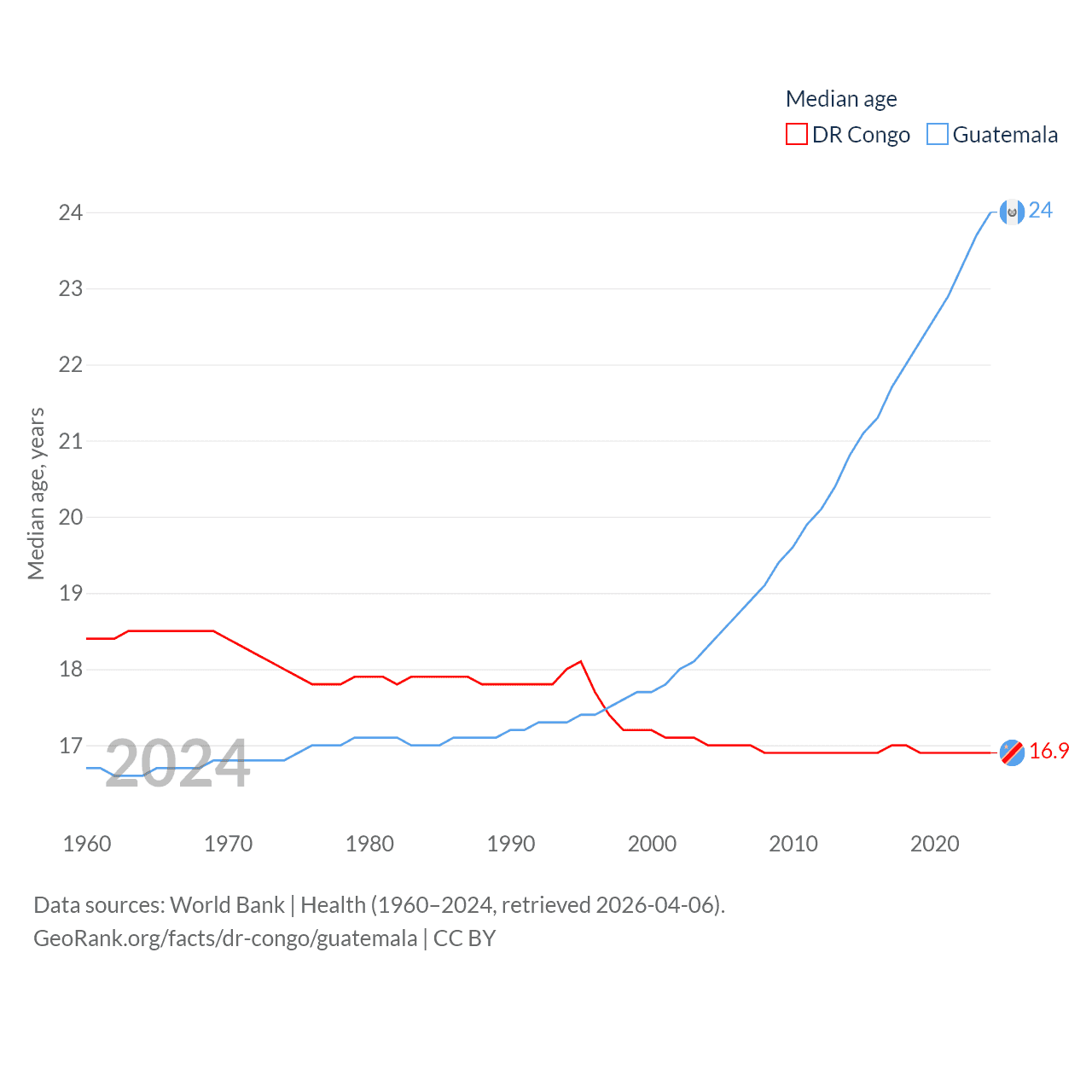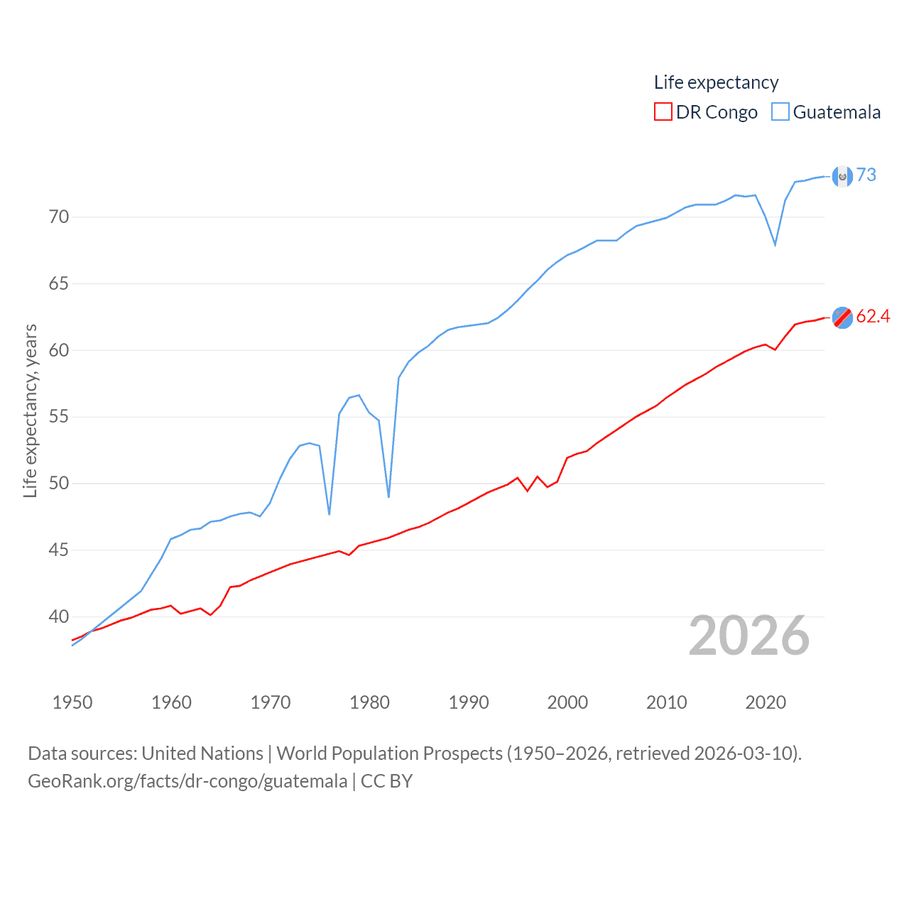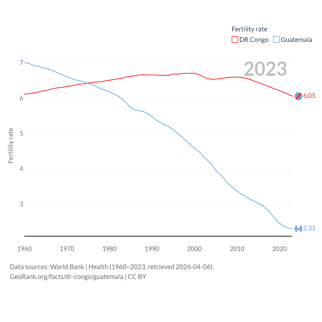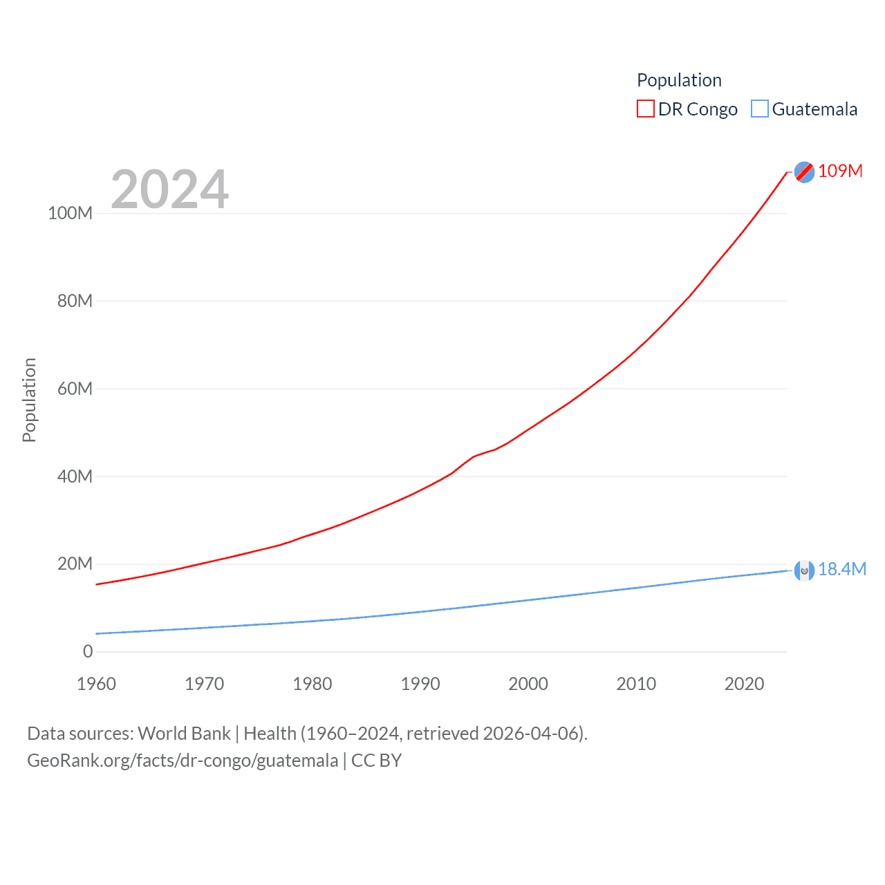 The DR Congo has a population of 109M (ranked 15/197), compared with 18.4M in Guatemala (ranked 70/197). The DR Congo's land area is 875,313 sq mi versus 41,375 sq mi for Guatemala (ranked 11th vs. 102nd).