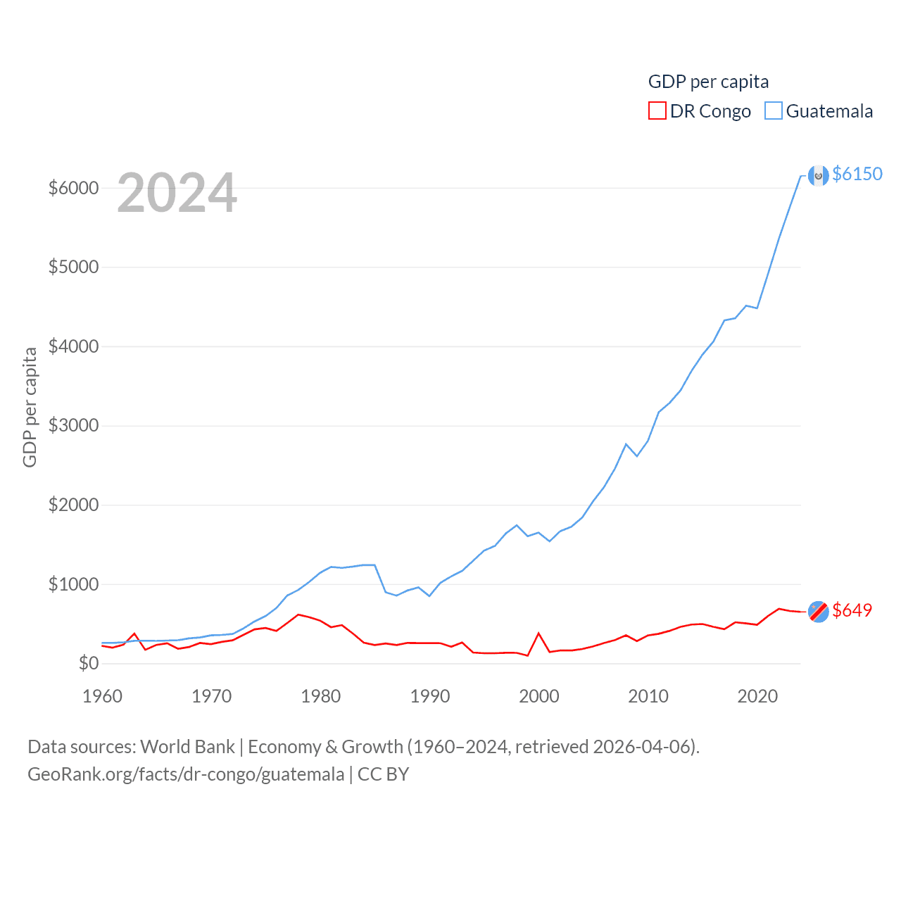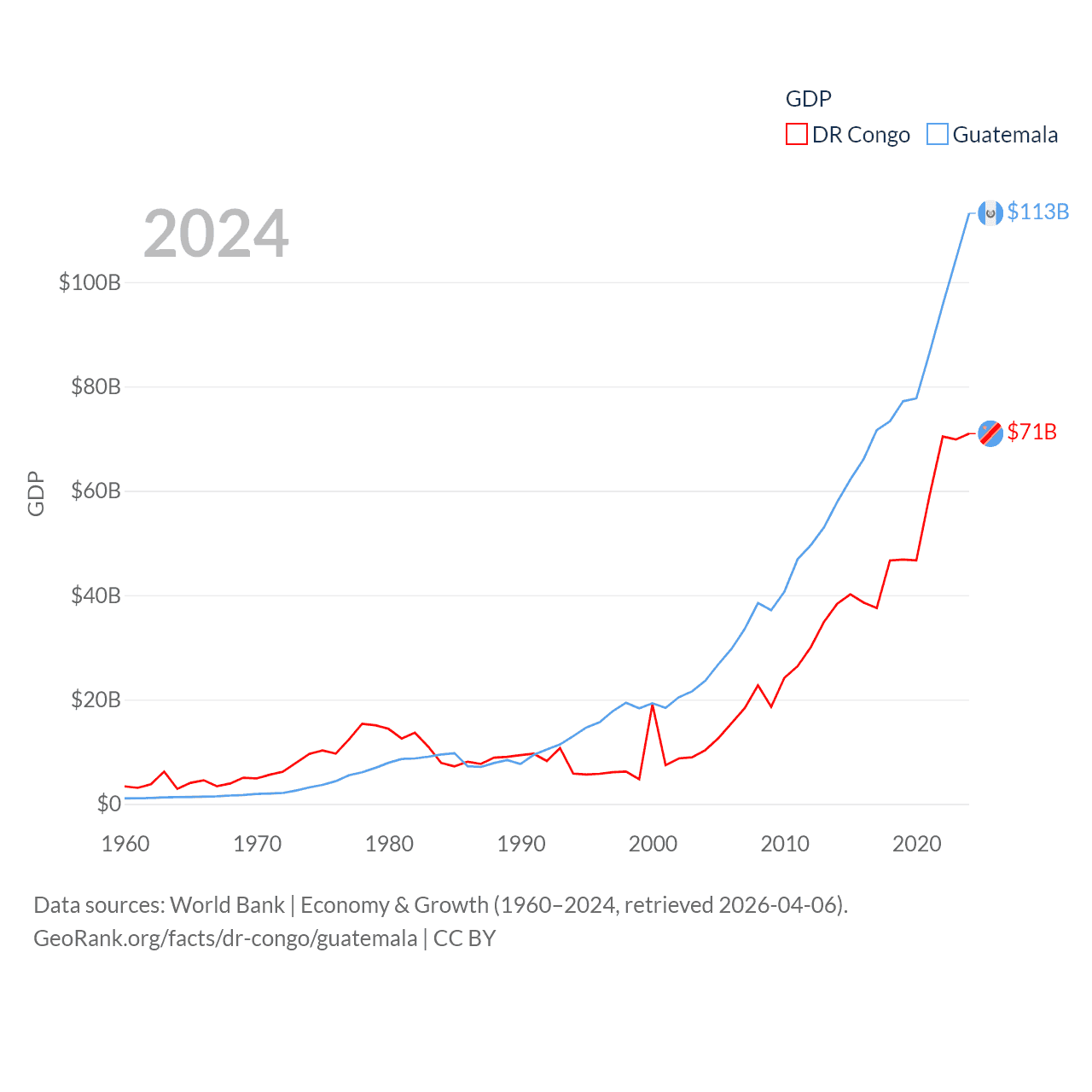 By GDP, The DR Congo ranks 87/197 ($71B) and Guatemala ranks 68/197 ($113B). By GDP per capita, The DR Congo ranks 190/197 ($649), while Guatemala ranks 112/197 ($6,150).