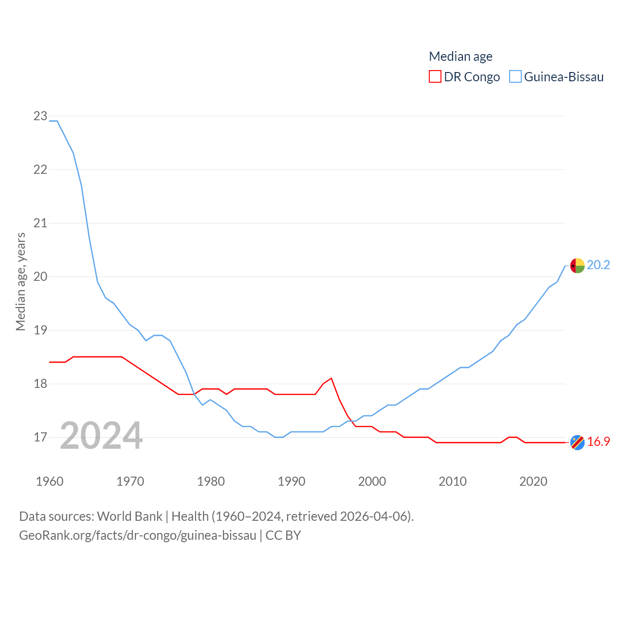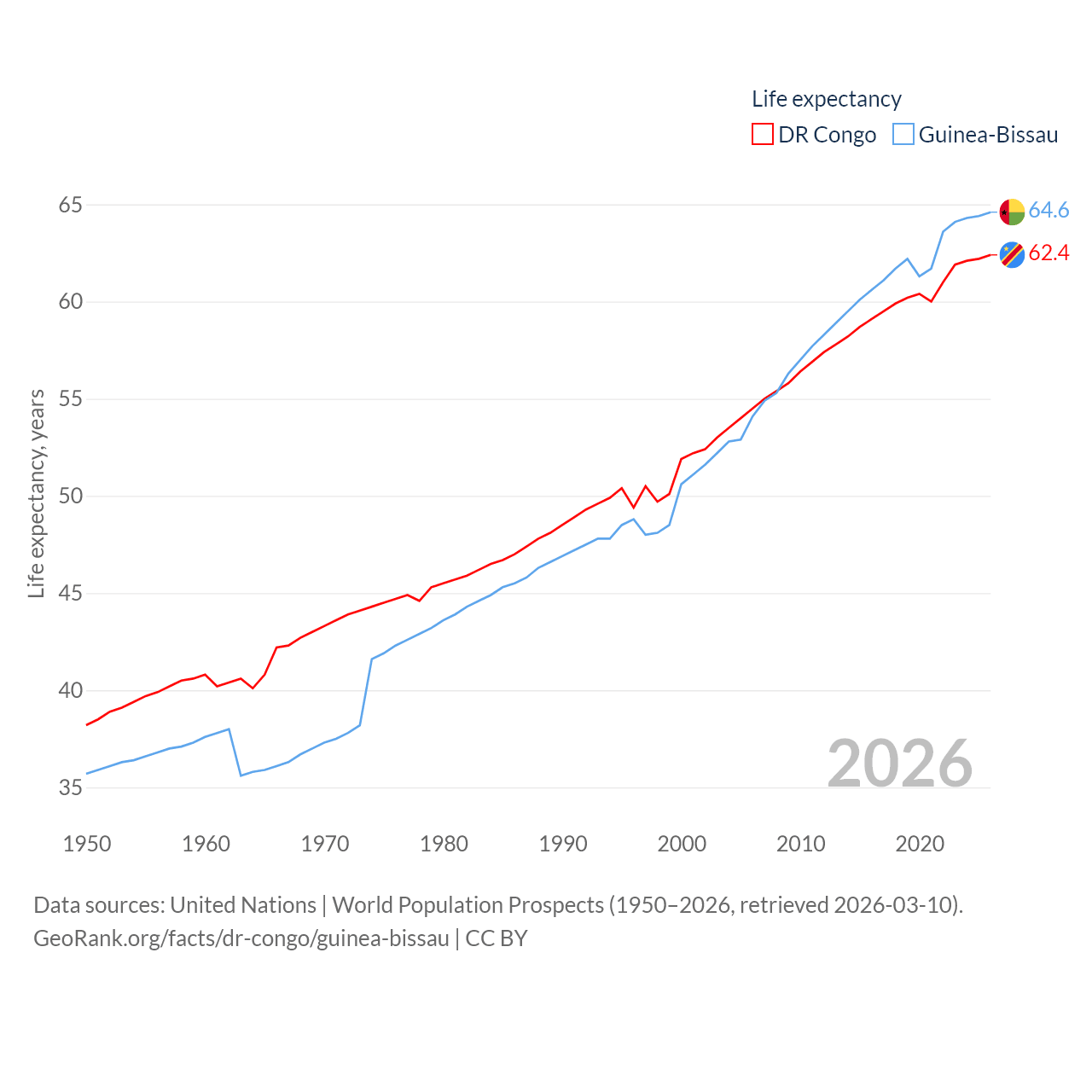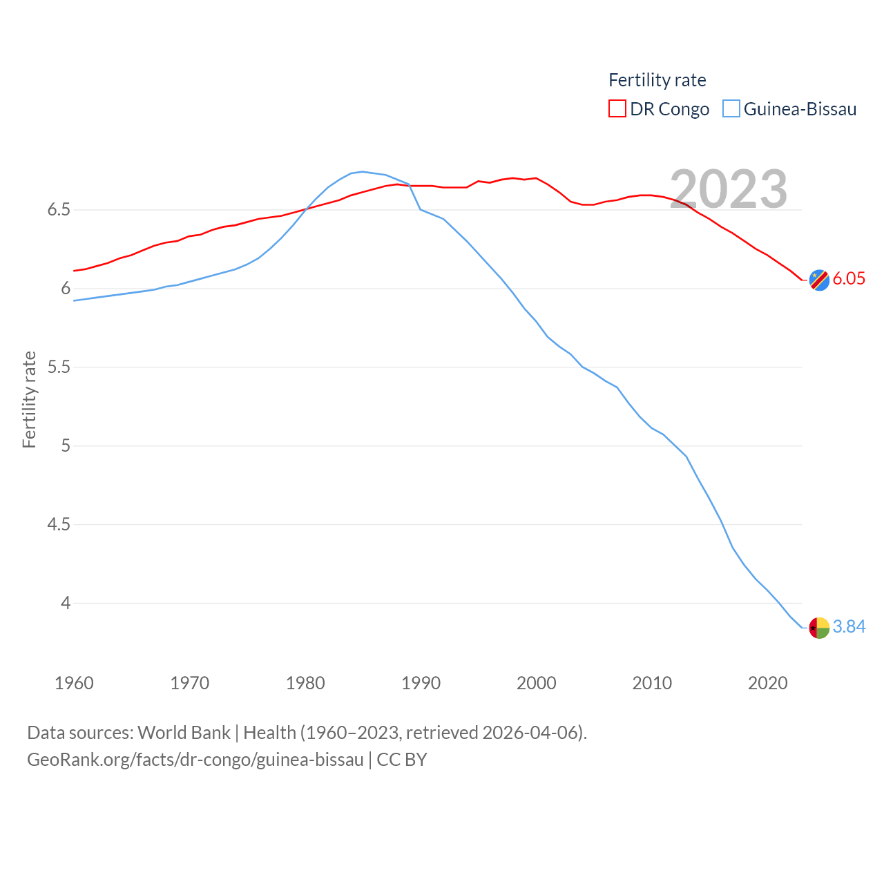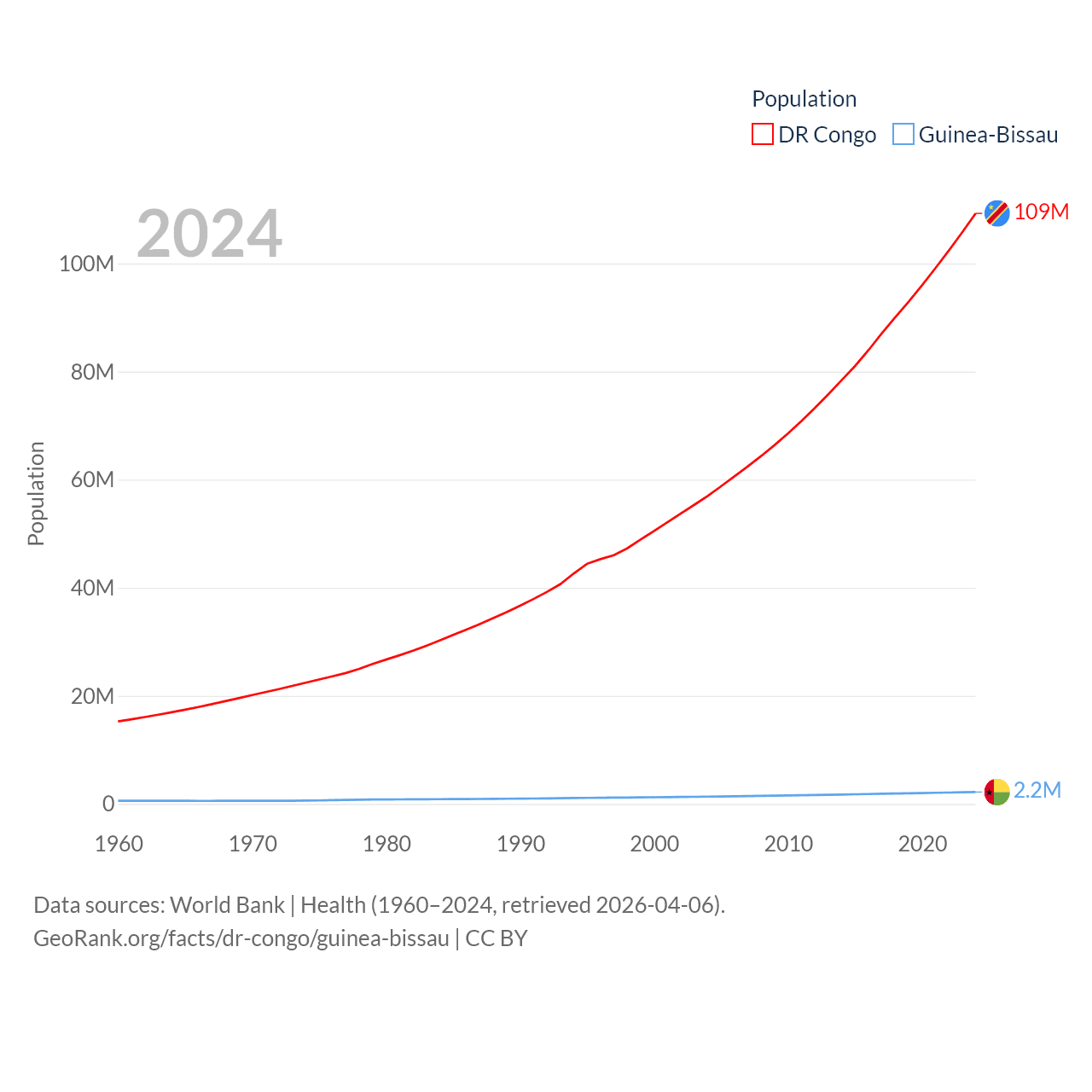 The DR Congo has a population of 109M (ranked 15/197), compared with 2.2M in Guinea-Bissau (ranked 146/197). The DR Congo's land area is 875,313 sq mi versus 10,857 sq mi for Guinea-Bissau (ranked 11th vs. 139th).