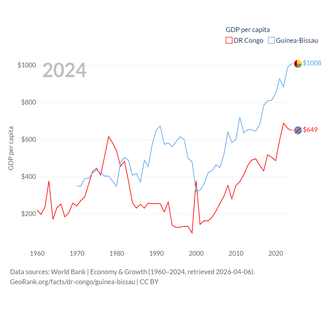 By GDP, The DR Congo ranks 87/197 ($71B) and Guinea-Bissau ranks 176/197 ($2.22B). By GDP per capita, The DR Congo ranks 190/197 ($649), while Guinea-Bissau ranks 177/197 ($1,008).