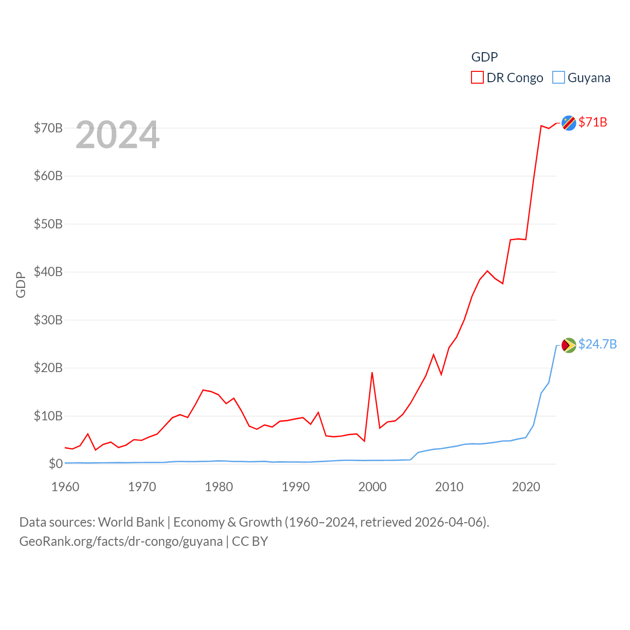 By GDP, The DR Congo ranks 87/197 ($71B) and Guyana ranks 120/197 ($24.7B). By GDP per capita, The DR Congo ranks 190/197 ($649), while Guyana ranks 41/197 ($29,675).