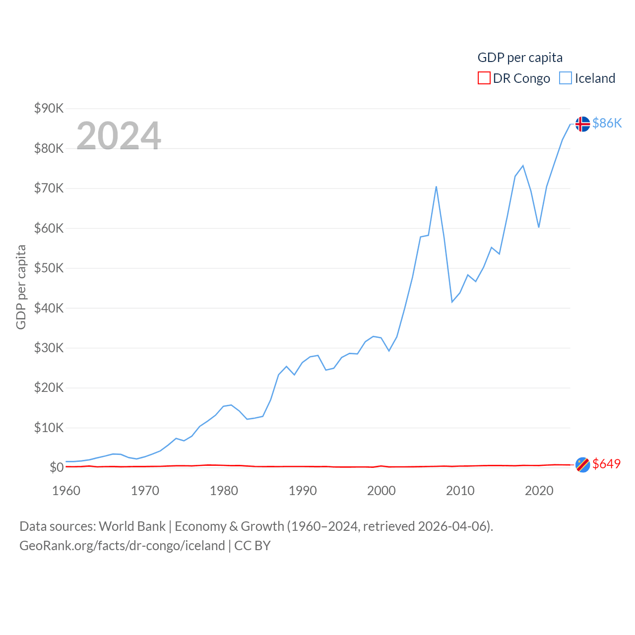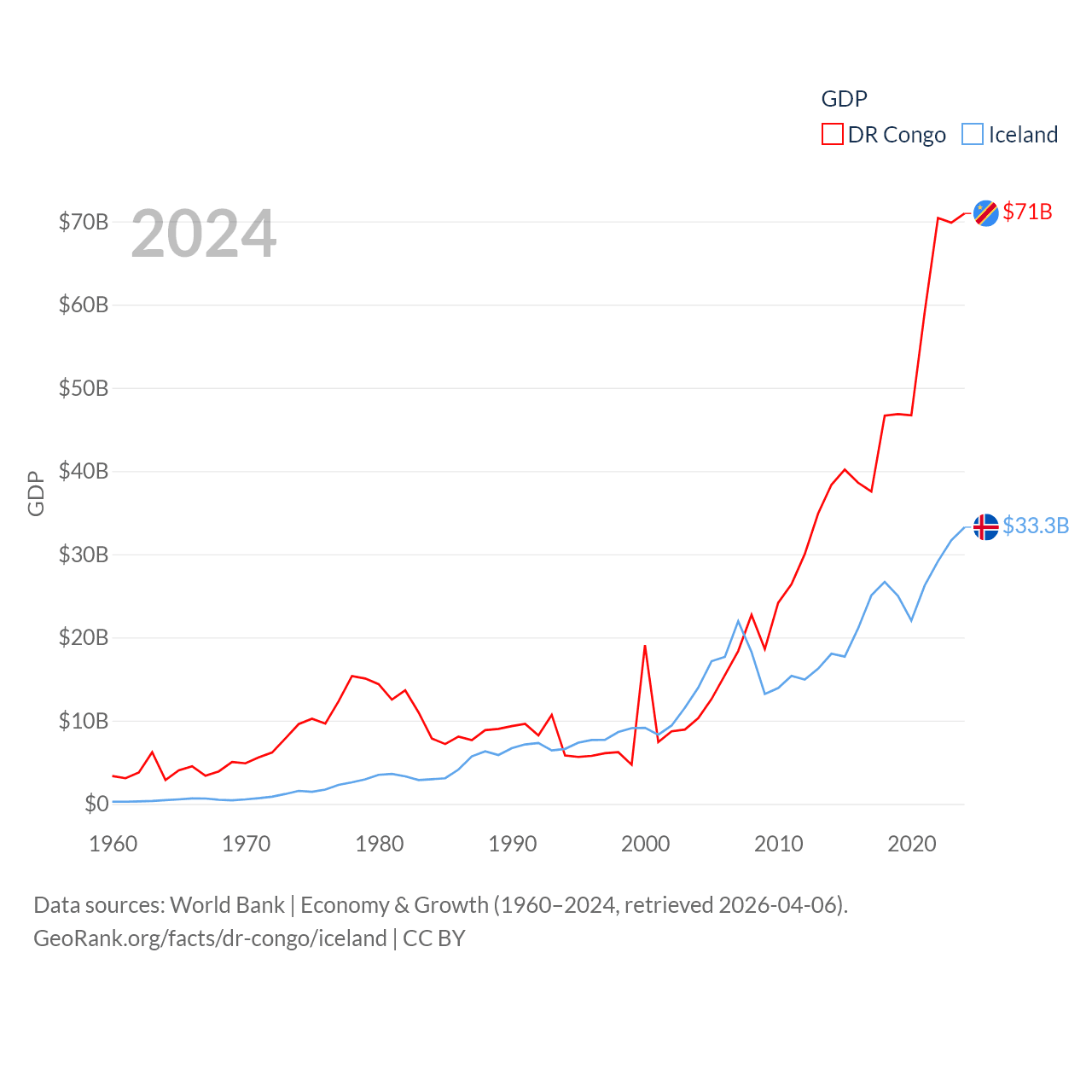 By GDP, The DR Congo ranks 87/197 ($71B) and Iceland ranks 108/197 ($33.3B). By GDP per capita, The DR Congo ranks 190/197 ($649), while Iceland ranks 9/197 ($86,041).