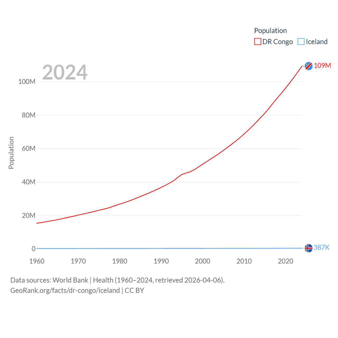 The DR Congo has a population of 109M (ranked 15/197), compared with 387K in Iceland (ranked 173/197). The DR Congo's land area is 875,313 sq mi versus 38,931 sq mi for Iceland (ranked 11th vs. 104th).